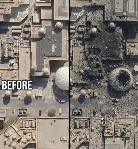 Hình ảnh được cho là trạm radar Mỹ tại Qatar bị phá hủy (phải) là sản phẩm giả mạo do AI tạo ra. Ảnh: Tehran Times/X