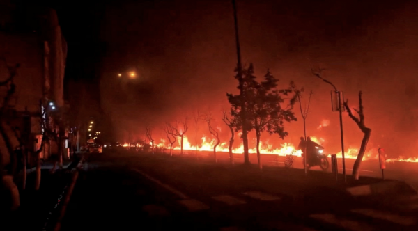 Lửa cháy dọc đại lộ Koohsar ở Tehran, trích từ video lan truyền trên mạng xã hội và được công bố hôm 8/3. Nhưng chatbot của mạng xã hội X từng gợi ý người dùng rằng hình ảnh này là từ vụ cháy rừng tại Los Angeles năm 2017. Ảnh: Mạng xã hội/Reuters.