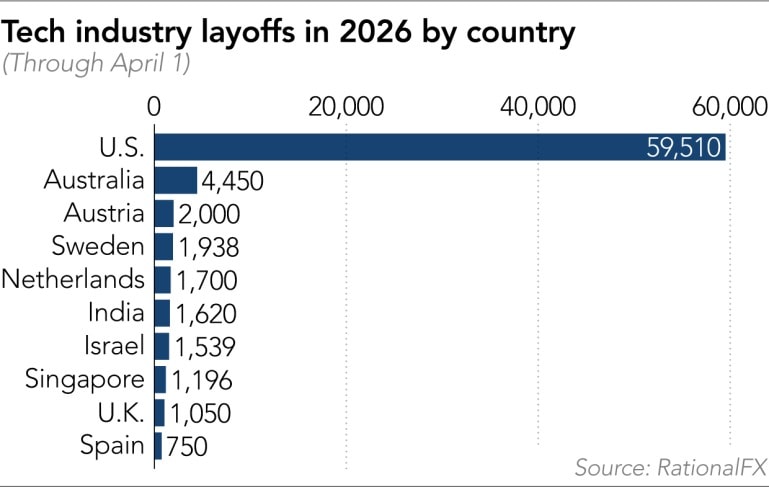 Theo phân tích chi tiết từ tổ chức RationalFX dựa trên các thông báo sa thải chính thức và dữ liệu từ cơ quan quản lý lao động, con số chính xác lên tới 78.557 việc làm liên quan nhân viên công nghệ đã hoàn toàn biến mất từ ngày 1.1 đến ngày 1.4. Trong bức tranh ảm đạm này, thị trường Mỹ chiếm tỉ trọng áp đảo với 76,7% tổng số ca sa thải. Điểm đáng chú ý nhất trong báo cáo của RationalFX là gần một nửa số lượng cắt giảm này, tương đương 37.638 vị trí, được cho là có nguyên nhân trực tiếp hoặc gián tiếp từ việc ứng dụng trí tuệ nhân tạo và nỗ lực tự động hóa quy trình làm việc của các tập đoàn.