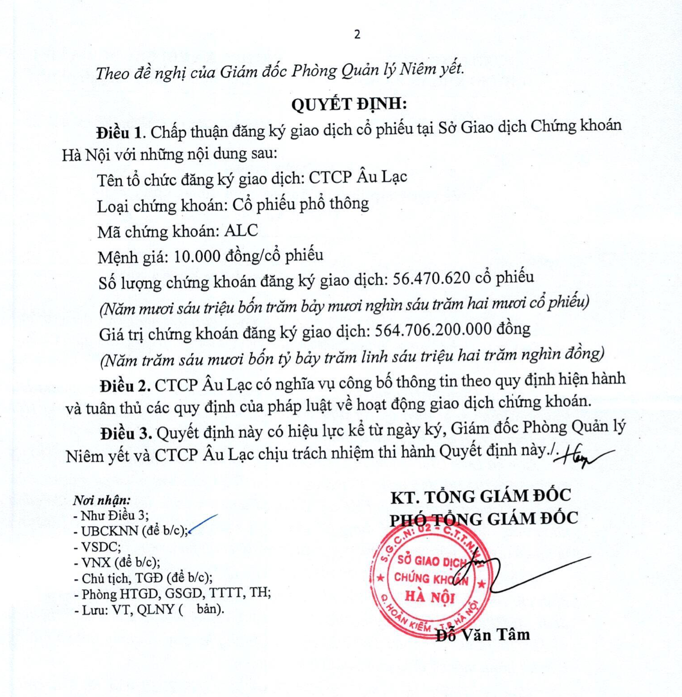Ngày 25/12, Sở giao dịch chứng khoán Hà Nội (HNX) đã ban hành quyết định về việc chấp thuận đăng ký giao dịch cổ phiếu của CTCP Âu Lạc với mã cổ phiếu ALC. Số lượng chứng khoán đăng ký giao dịch là gần 56,5 triệu cổ phiếu.