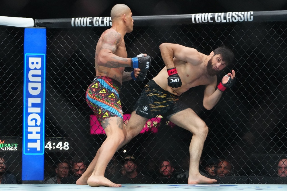 Alex Pereira (trái) hạ knock-out Magomed Ankalaev để giành lại đai vô địch hạng dưới nặng UFC.