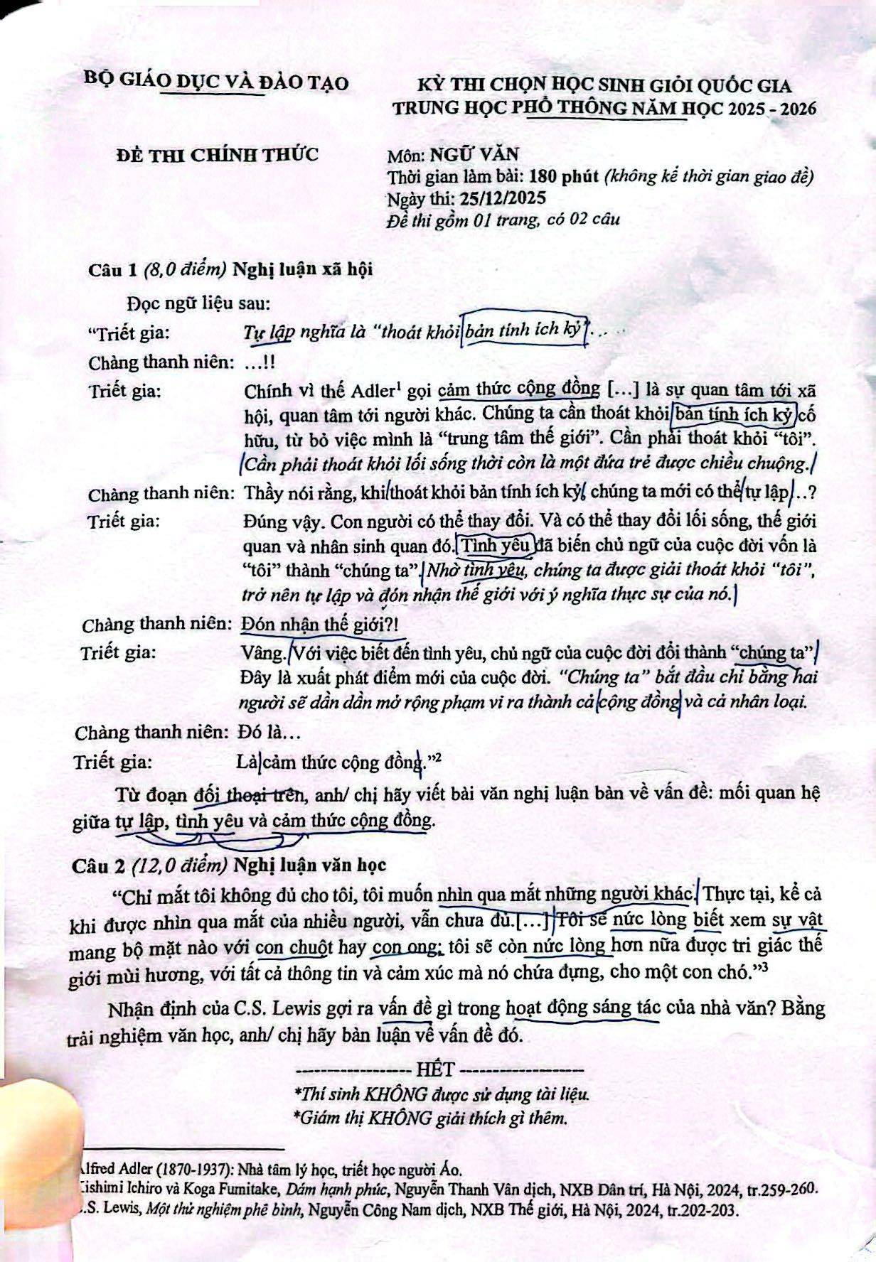Đề môn Ngữ văn của Kỳ thi Chọn học sinh giỏi Quốc gia THPT năm học 2025-2026 xuất hiện trên nhiều nền tảng mạng xã hội với những câu nói: “Tự lập nghĩa là ‘thoát khỏi bản tính ích kỷ’”, “Chính vì thế mà Adler gọi cảm thức cộng đồng [...] là sự quan tâm tới xã hội, quan tâm tới người khác. Chúng ta cần thoát khỏi bản tính ích kỷ cố hữu, từ bỏ việc mình là ‘trung tâm thế giới’. Cần phải thoát khỏi ‘tôi’. Cần phải thoát khỏi lối sống thời còn là một đứa trẻ được chiều chuộng”...