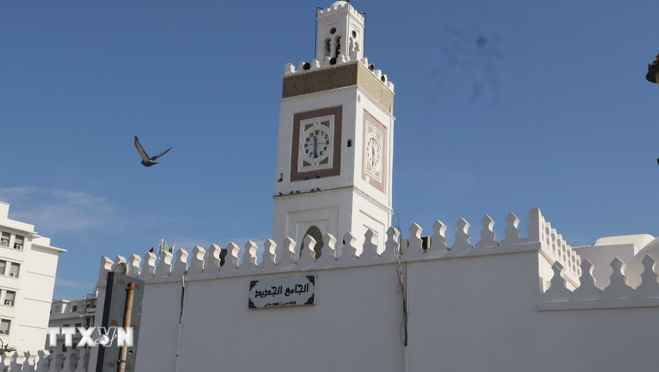 Nhà thờ Hồi giáo sơn trắng với cột đồng hồ lớn ở thủ đô Algiers.(Ảnh: Mạnh Hùng/TTXVN)