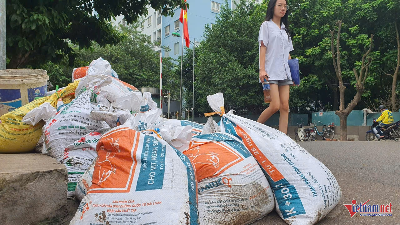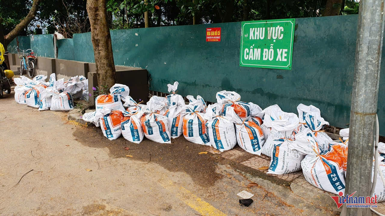 Cư dân Ecohome 1 đã mua hàng trăm bao tải cát để sẵn sàng ứng phó với mưa ngập.