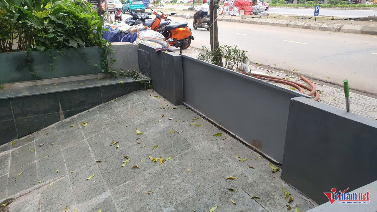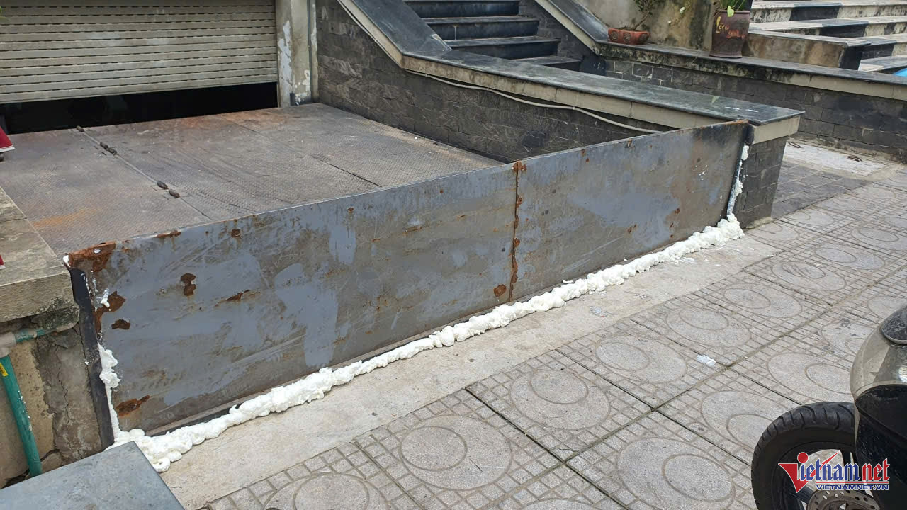 Không chỉ các hộ dân, nhiều cơ sở kinh doanh cũng ráo riết triển khai biện pháp chống ngập. Tại một phòng giao dịch ngân hàng trong khu đô thị Geleximco, hệ thống cửa chắn nước bằng sắt, vận hành bằng thủy lực, đã được lắp đặt. Thiết bị này được thiết kế âm dưới nền, chỉ cần nhấn nút kích hoạt, tấm chắn sẽ tự động bật lên, biến cửa ra vào thành “bức tường thép” ngăn nước.