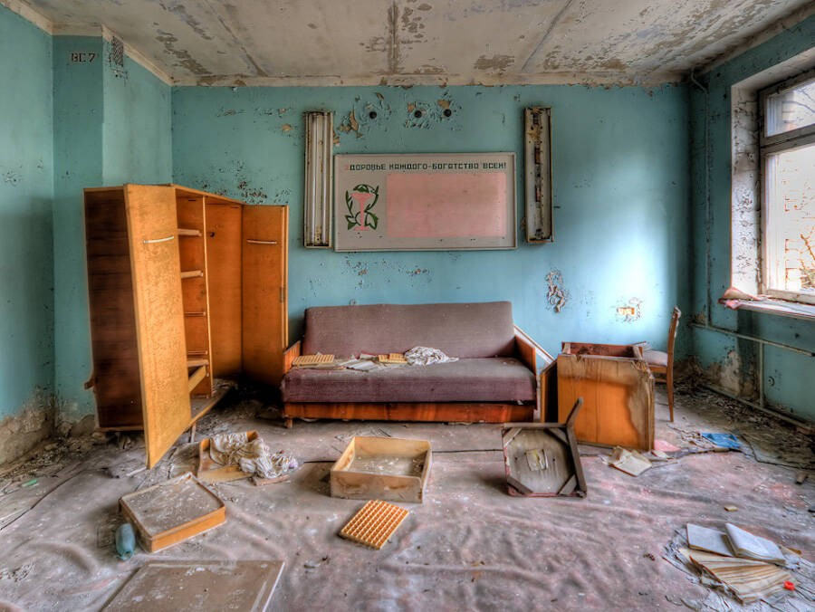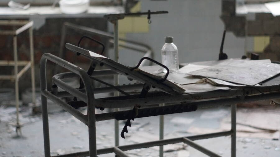 Quần áo và các vật dụng khác mà lực lượng cứu hộ bỏ lại vẫn nằm trong bệnh viện bỏ hoang này, phát ra mức phóng xạ cao. Ảnh: Flickr.