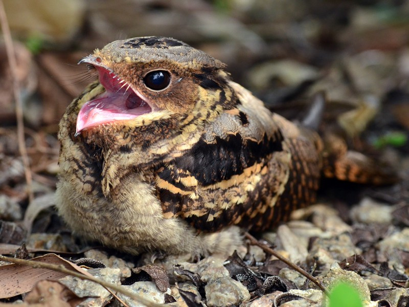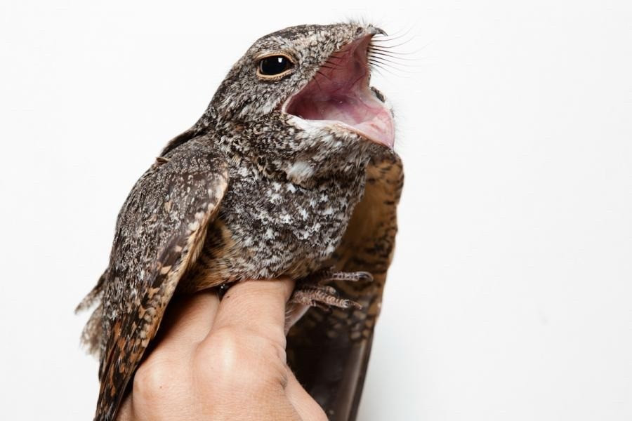 Miệng của chim cú muỗi rộng bất thường so với kích thước đầu. Cấu trúc miệng lớn cùng các sợi lông cứng quanh mép giúp chúng “hớp” con mồi giữa không trung, tăng khả năng săn bắt trong điều kiện ánh sáng yếu. Ảnh: tumblr.com.