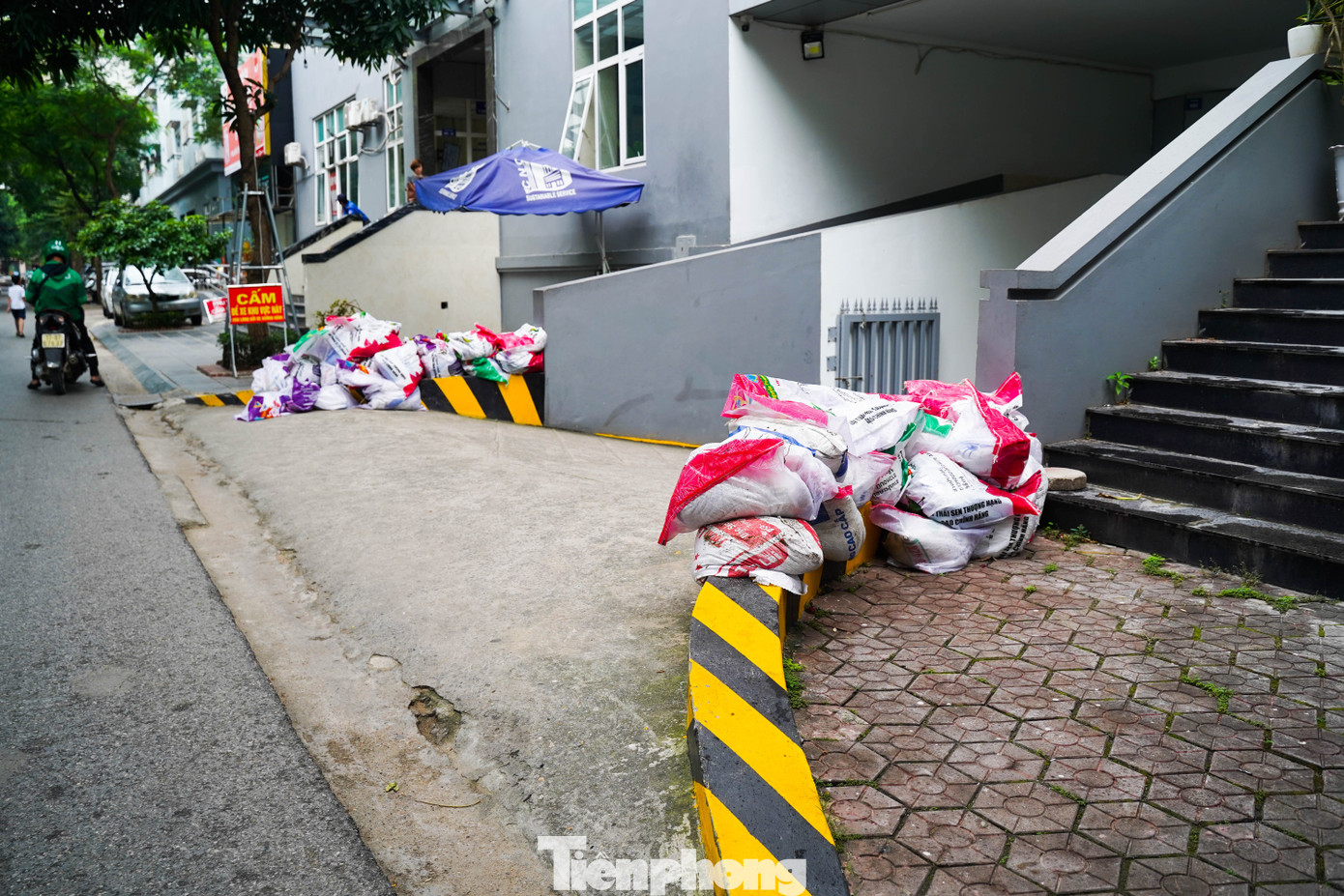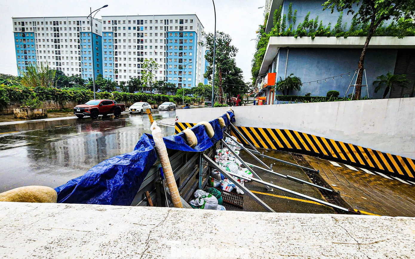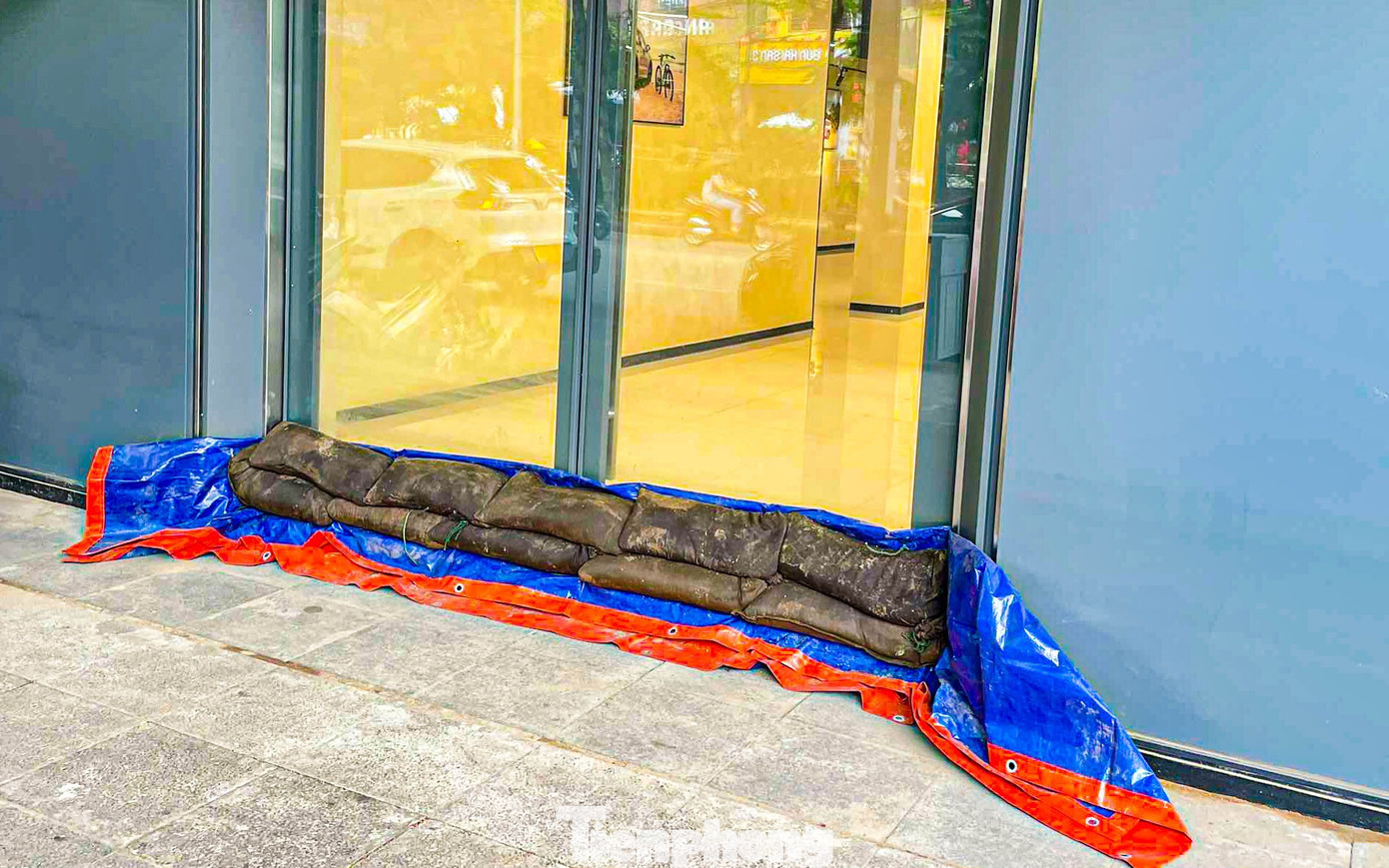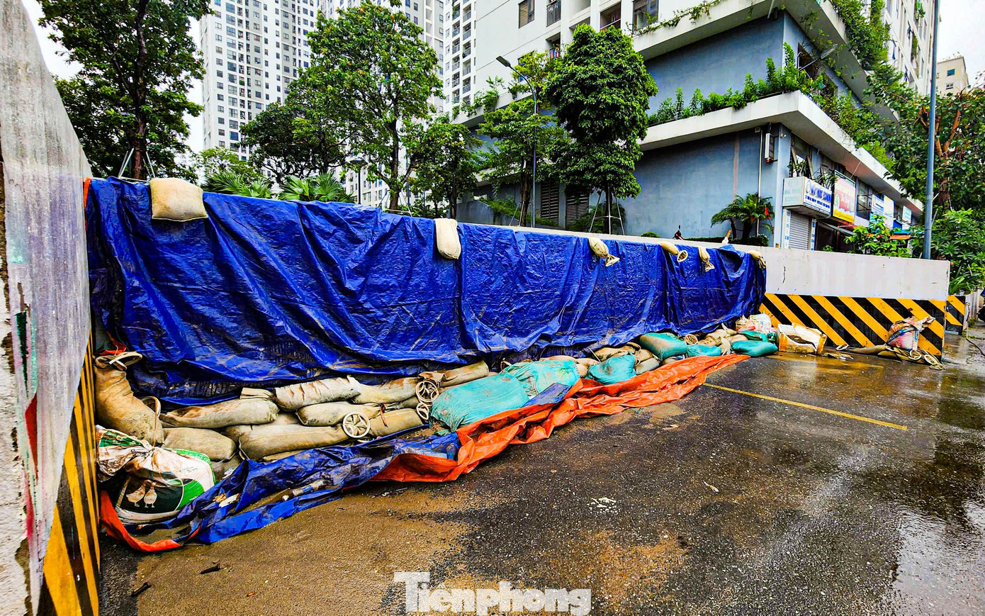 Trước cửa nhiều tòa nhà khu vực Ecohome (phường Đông Ngạc), người dân đã chủ động xếp bao cát, căng bạt chắn nhằm ngăn nước tràn vào nhà khi mưa lớn.