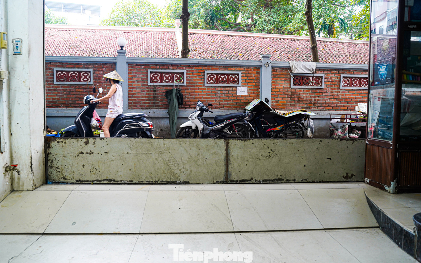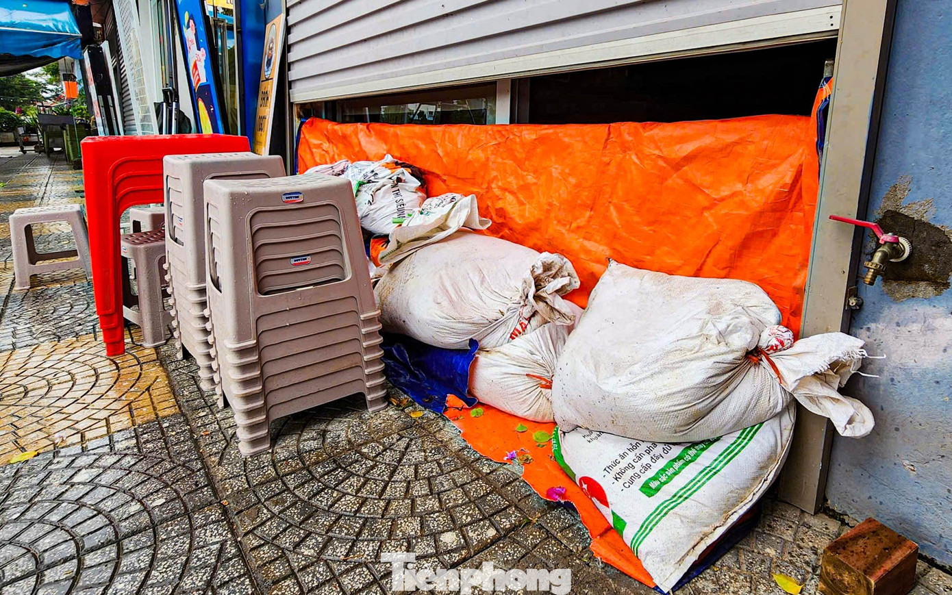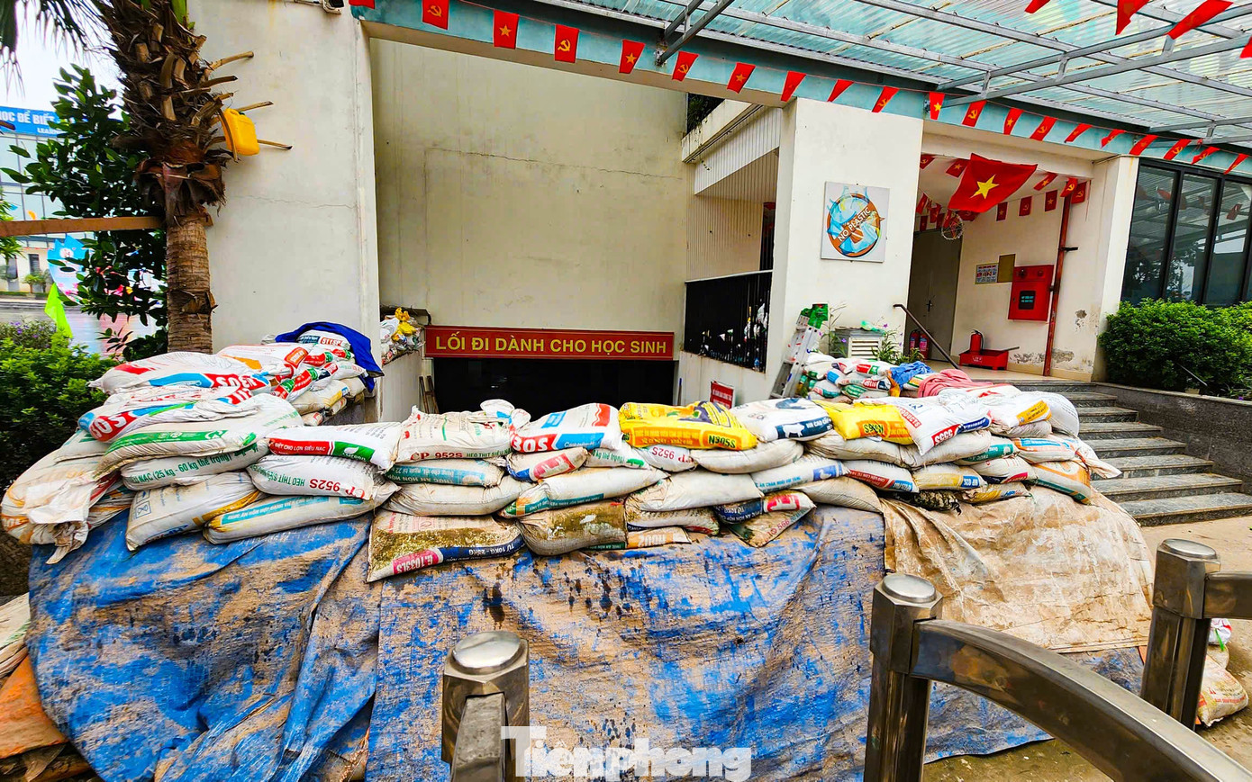 Tại Trường Tiểu học Đông Ngạc, lối vào được gia cố bằng bao tải cát và bạt nhằm ngăn nước tràn vào lớp học. "Đây là công tác chuẩn bị từ bão số 10, chúng tôi giữ nguyên đến nay để ứng phó với bão số 11,’ đại diện nhà trường cho biết", một bảo vệ chia sẻ.