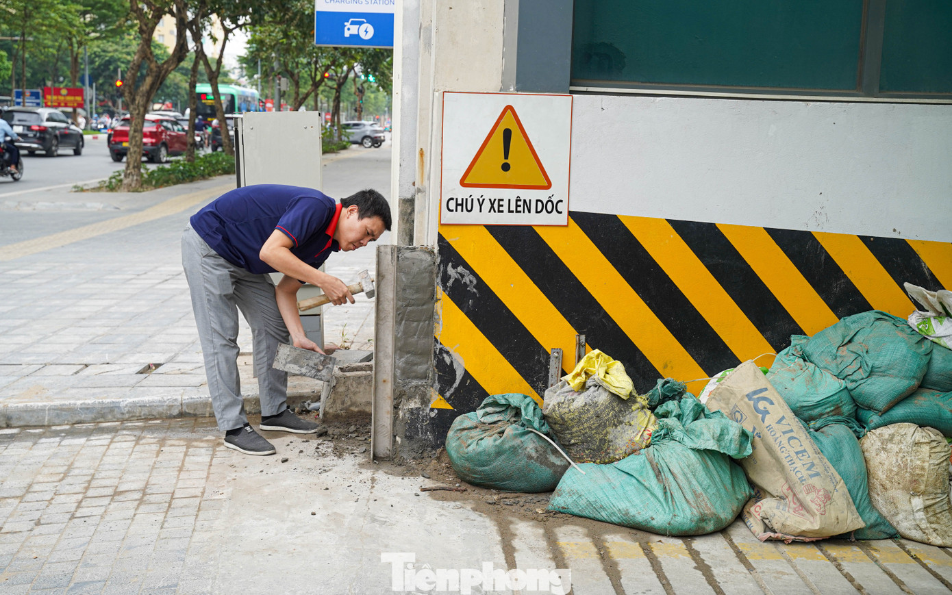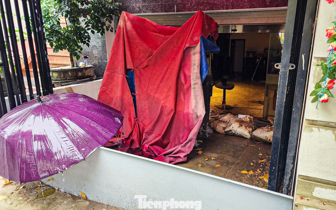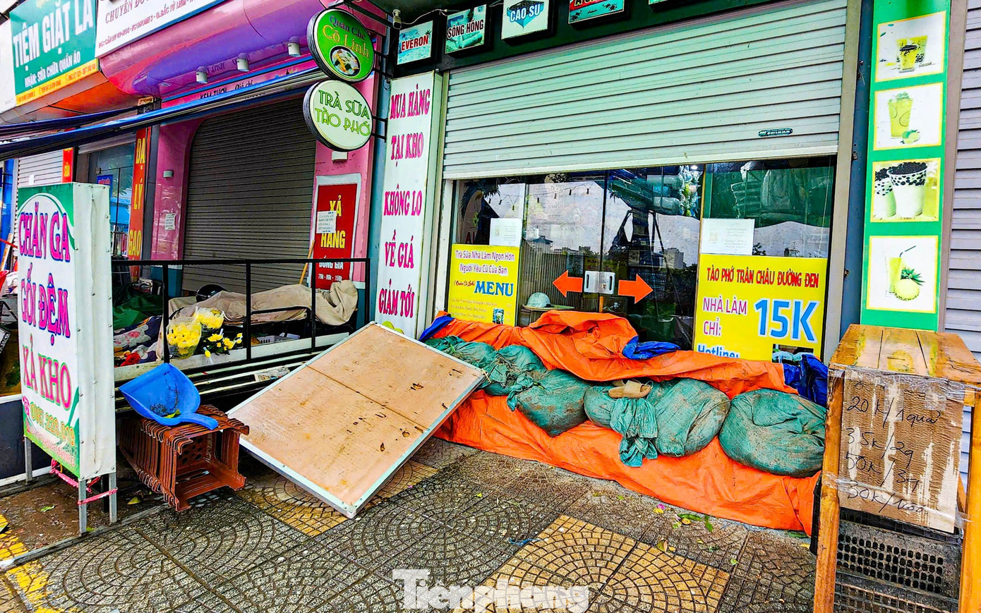 Tại Trường Tiểu học Đông Ngạc, lối vào được gia cố bằng bao tải cát và bạt nhằm ngăn nước tràn vào lớp học. "Đây là công tác chuẩn bị từ bão số 10, chúng tôi giữ nguyên đến nay để ứng phó với bão số 11,’ đại diện nhà trường cho biết", một bảo vệ chia sẻ.