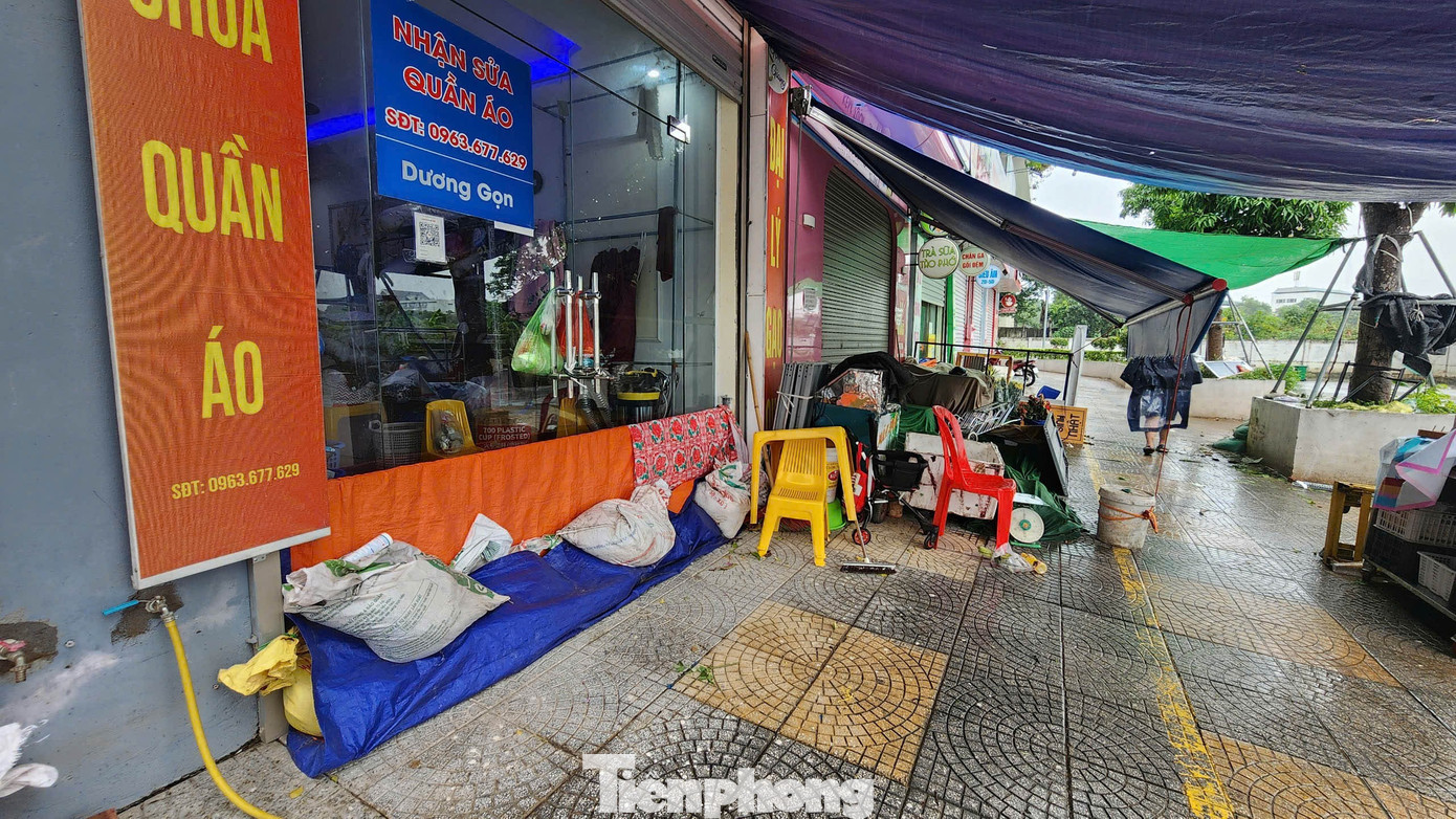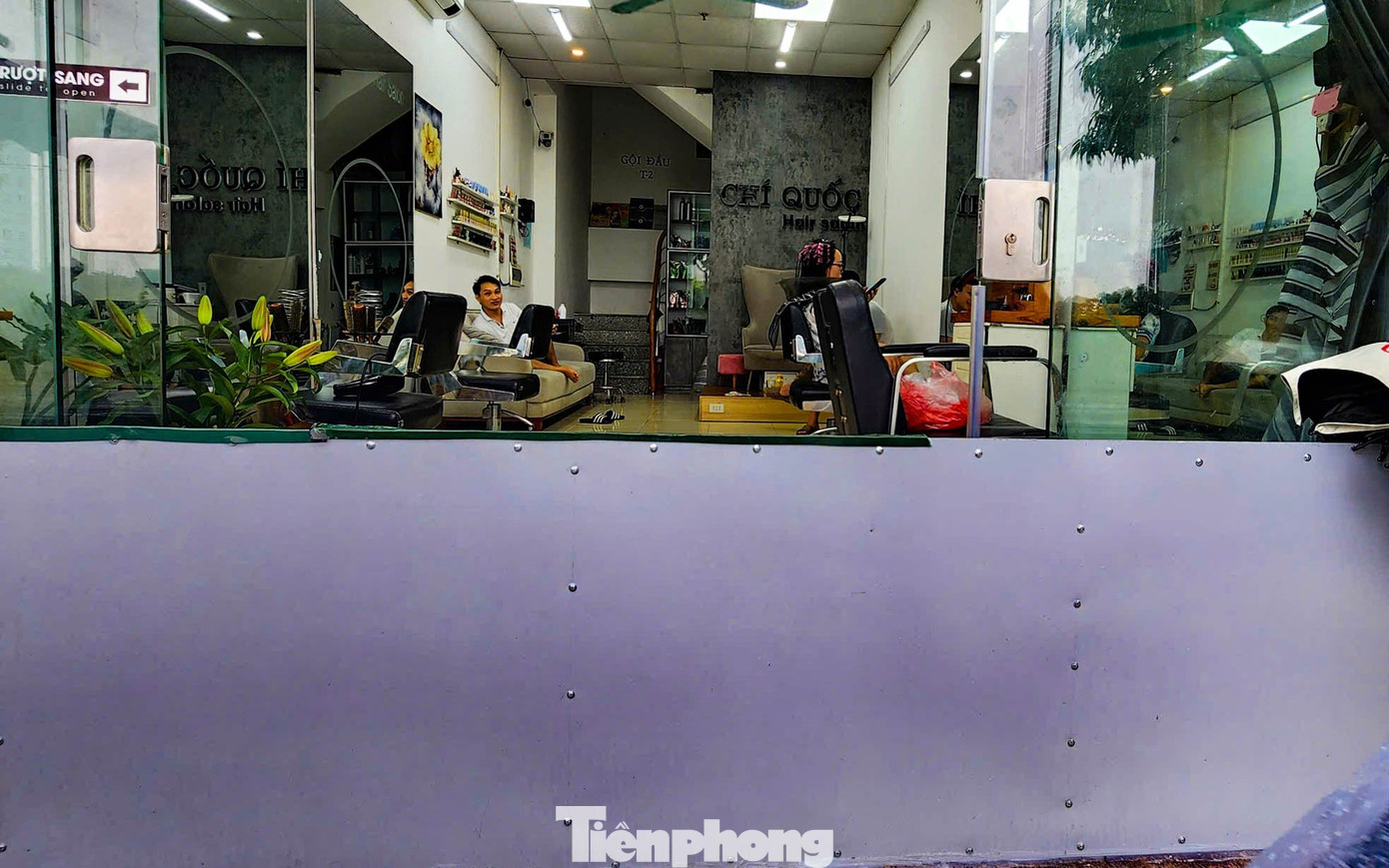 Vách ngăn nước cao khoảng 50 cm được dựng tại một cơ sở hớt tóc ở khu đô thị Ecohome. Anh Hiếu, chủ cơ sở, cho biết: ‘Hôm 30/9, tôi không chuẩn bị gì nên nước mưa tràn hết vào nhà. Nhìn dự báo hôm nay và ngày mai có mưa lớn, tôi đã chủ động dựng vách chắn để hạn chế ngập".