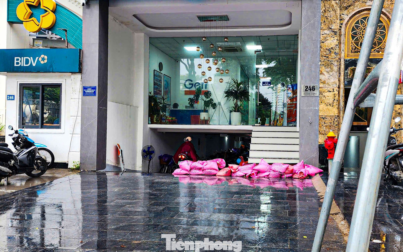 Một hộ dân tại khu vực trũng trên đường Võ Chí Công (gần cầu Nhật Tân) cũng chủ động chuẩn bị mọi thứ, từ bao cát, vách chắn đến kê cao đồ đạc.