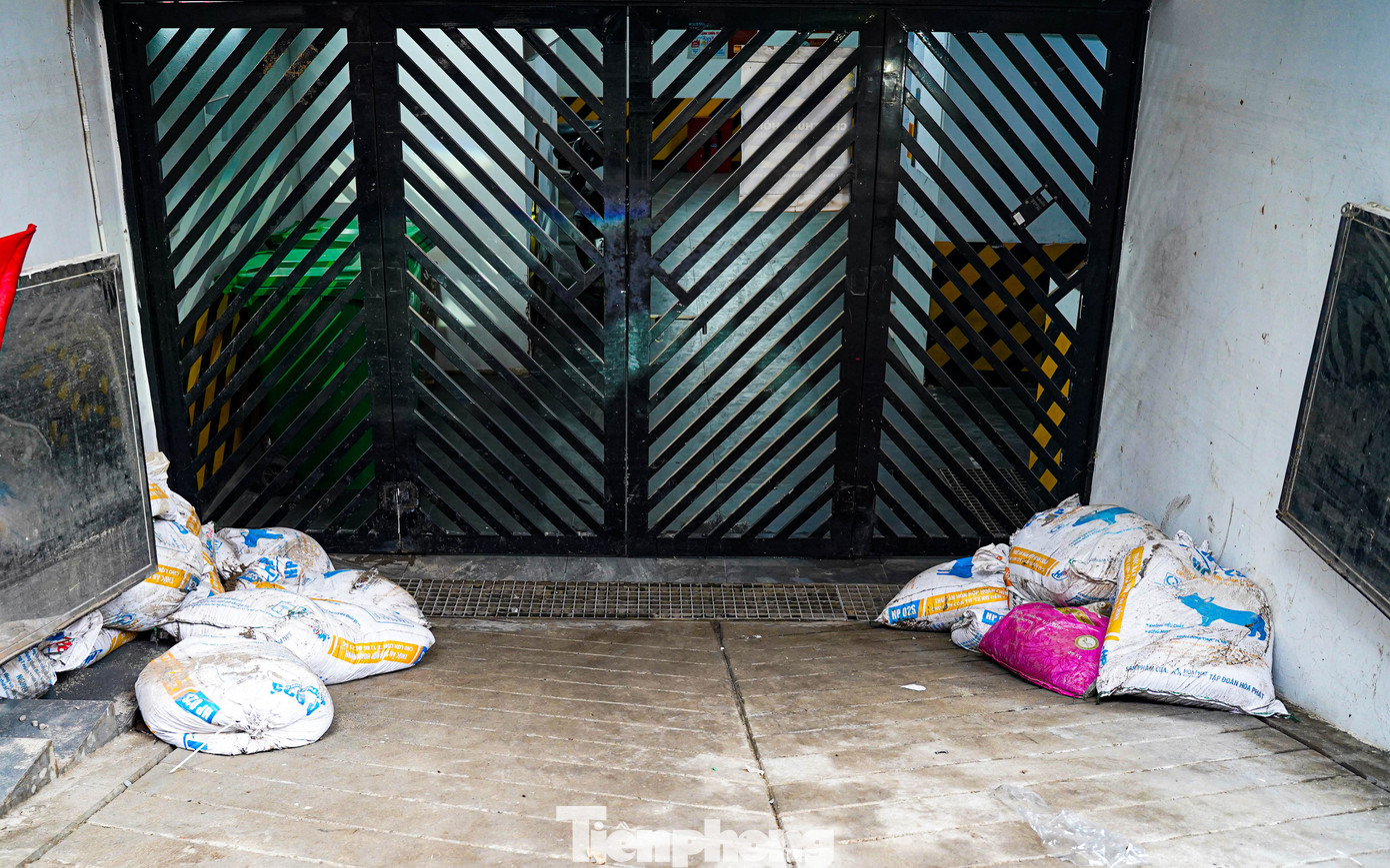 Khu vực gửi xe của cư dân, ban quản lý tòa nhà cũng đã dựng vách ngăn kết hợp với bao cát làm ‘lá chắn’ chống nước khi mưa lớn.