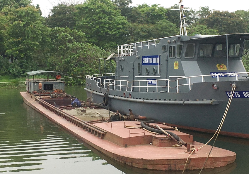Khai thác cát sỏi vô tội vạ là một nguyên nhân dẫn đến sạt lở đôi bờ (Trong ảnh: Một phương tiện vi phạm khai thác cát trên sông Hương bị bắt giữ)