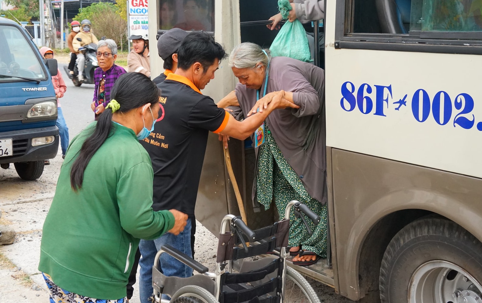 Tình nguyện viên “Mái nhà đồng cảm và sẻ chia” túc trực để giúp đỡ các cô chú đi lại khó khăn
