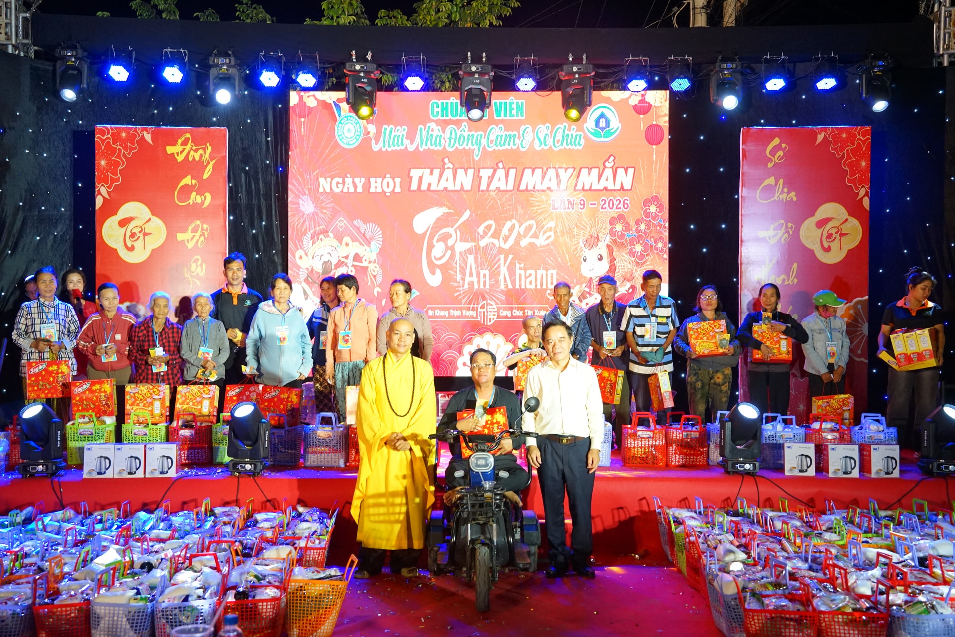 Chiều cuối năm se lạnh, khoảng 200 người từ các xã Tân Minh, Hàm Tân và phường La Gi (Lâm Đồng) được đưa đón bằng những chuyến xe buýt “0 đồng” về sân chùa Kỳ Viên để tham dự Chương trình thiện nguyện “Thần tài may mắn” lần thứ 9 – 2026. Họ gặp lại nhau, hỏi han cùng dùng bữa cơm tất niên và thưởng thức chương trình văn nghệ trước khi trở về với cuộc mưu sinh thường nhật.