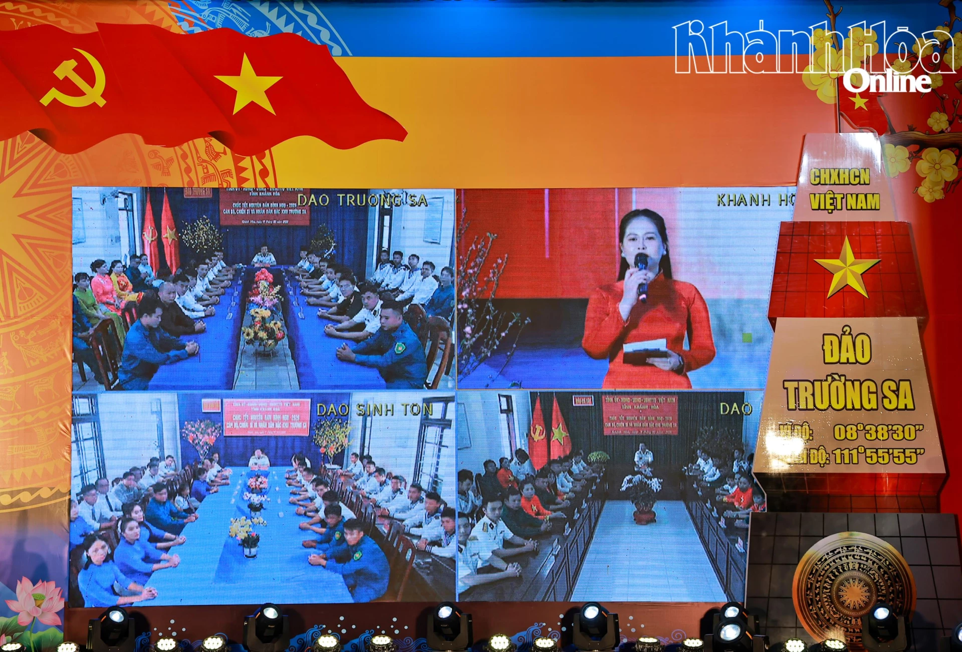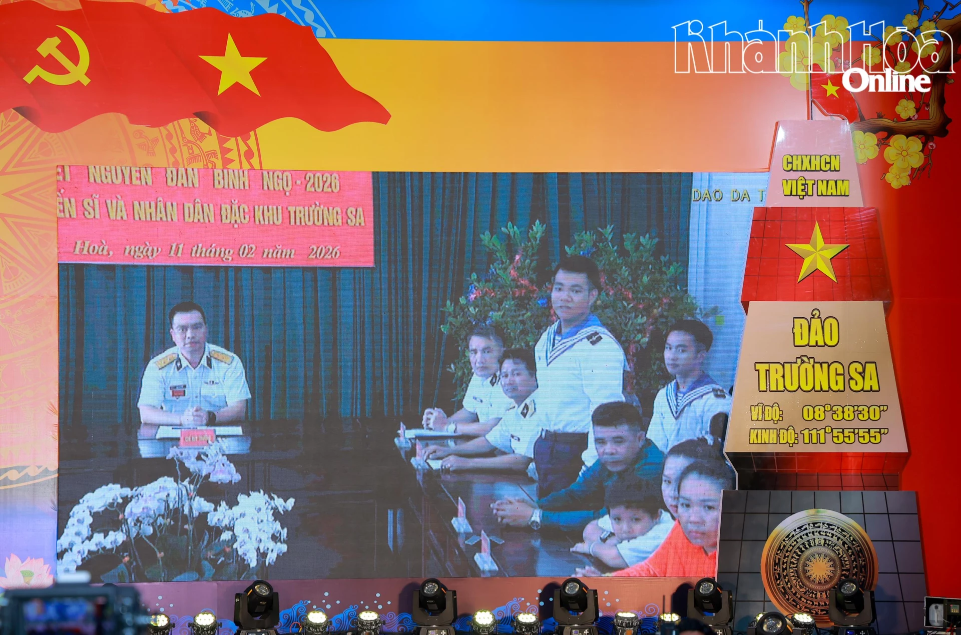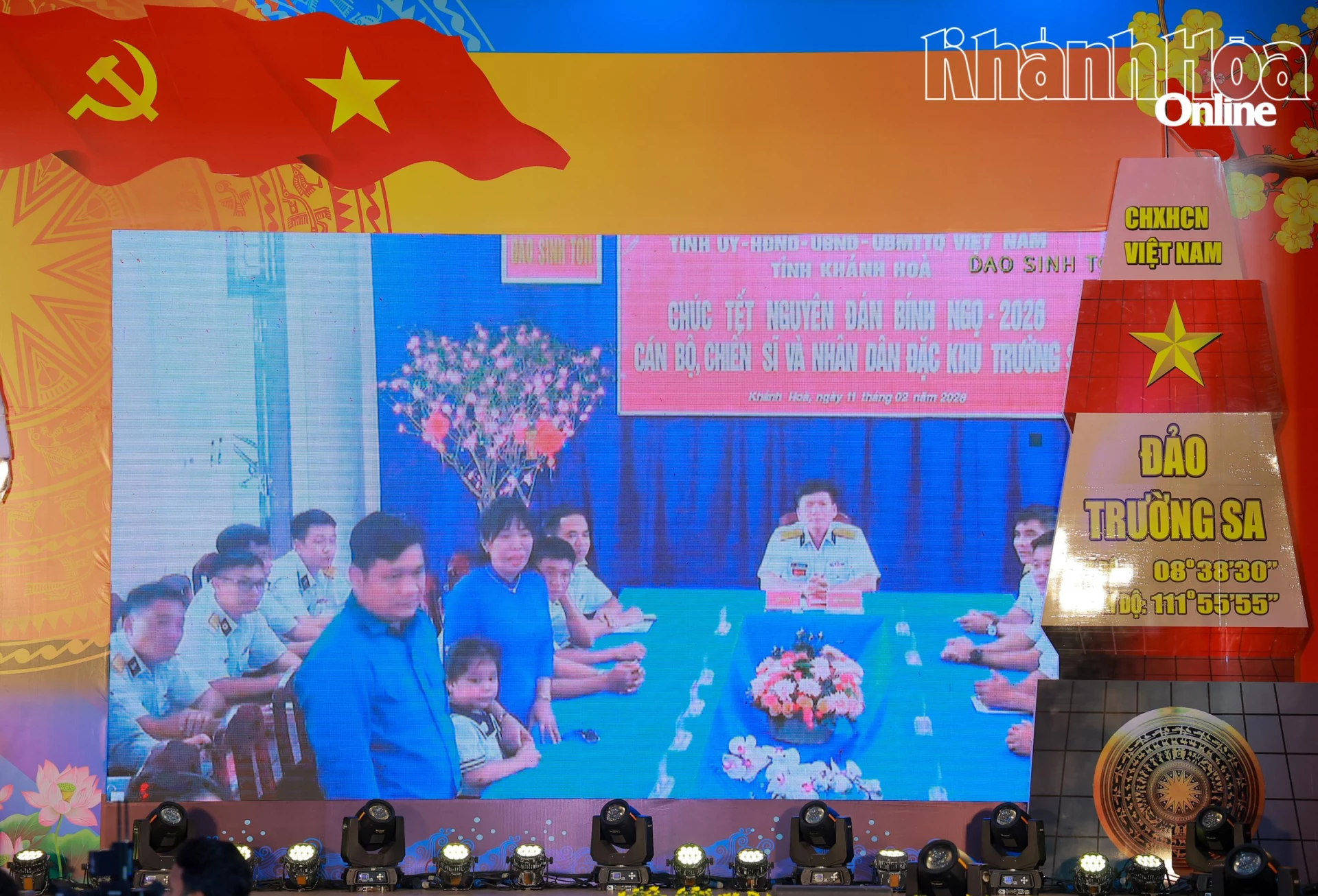 Chiều 11-2, Tỉnh ủy, HĐND, UBND, Ủy ban MTTQ Việt Nam tỉnh Khánh Hòa tổ chức cầu truyền hình trực tuyến chúc Tết Nguyên đán Bính Ngọ 2026 đến cán bộ, chiến sĩ và Nhân dân đặc khu Trường Sa. Đến dự chương trình tại điểm cầu phường Nha Trang có các đồng chí: Nghiêm Xuân Thành - Ủy viên Trung ương Đảng, Bí thư Tỉnh ủy; Trần Phong - Ủy viên Trung ương Đảng, Phó Bí thư Tỉnh ủy, Chủ tịch UBND tỉnh; Hồ Xuân Trường - Ủy viên dự khuyết Trung ương Đảng, Phó Bí thư Thường trực Tỉnh ủy; Lâm Đông - Phó Bí thư Tỉnh ủy, Chủ tịch HĐND tỉnh; Nguyễn Khắc Hà - Phó Bí thư Tỉnh ủy, Chủ tịch Ủy ban MTTQ Việt Nam tỉnh; Thượng tá Bùi Xuân Bình - Bí thư Đảng ủy, Chính ủy Vùng 4 Hải quân; các đồng chí trong Ban Thường vụ Tỉnh ủy; Thường trực HĐND tỉnh, lãnh đạo UBND tỉnh; lãnh đạo các sở, ban, ngành, địa phương, doanh nghiệp; cán bộ, chiến sĩ đang công tác tại Vùng 4 Hải quân; thân nhân cán bộ, chiến sĩ, người dân đang sinh sống, công tác ở đặc khu Trường Sa. Cầu truyền hình được kết nối trực tuyến đến các điểm cầu ở đảo Trường Sa, đảo Sinh Tồn, đảo Đá Tây.
