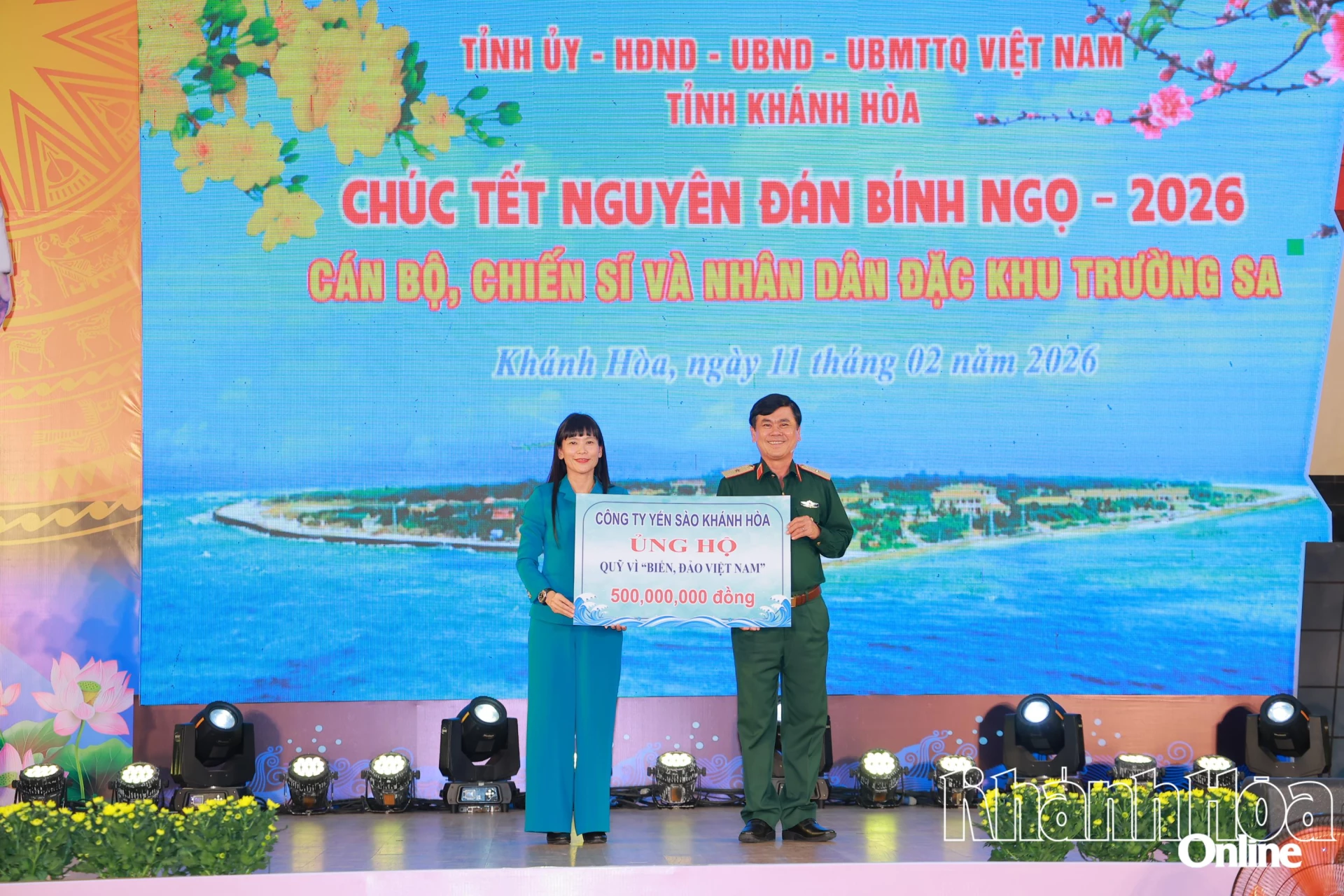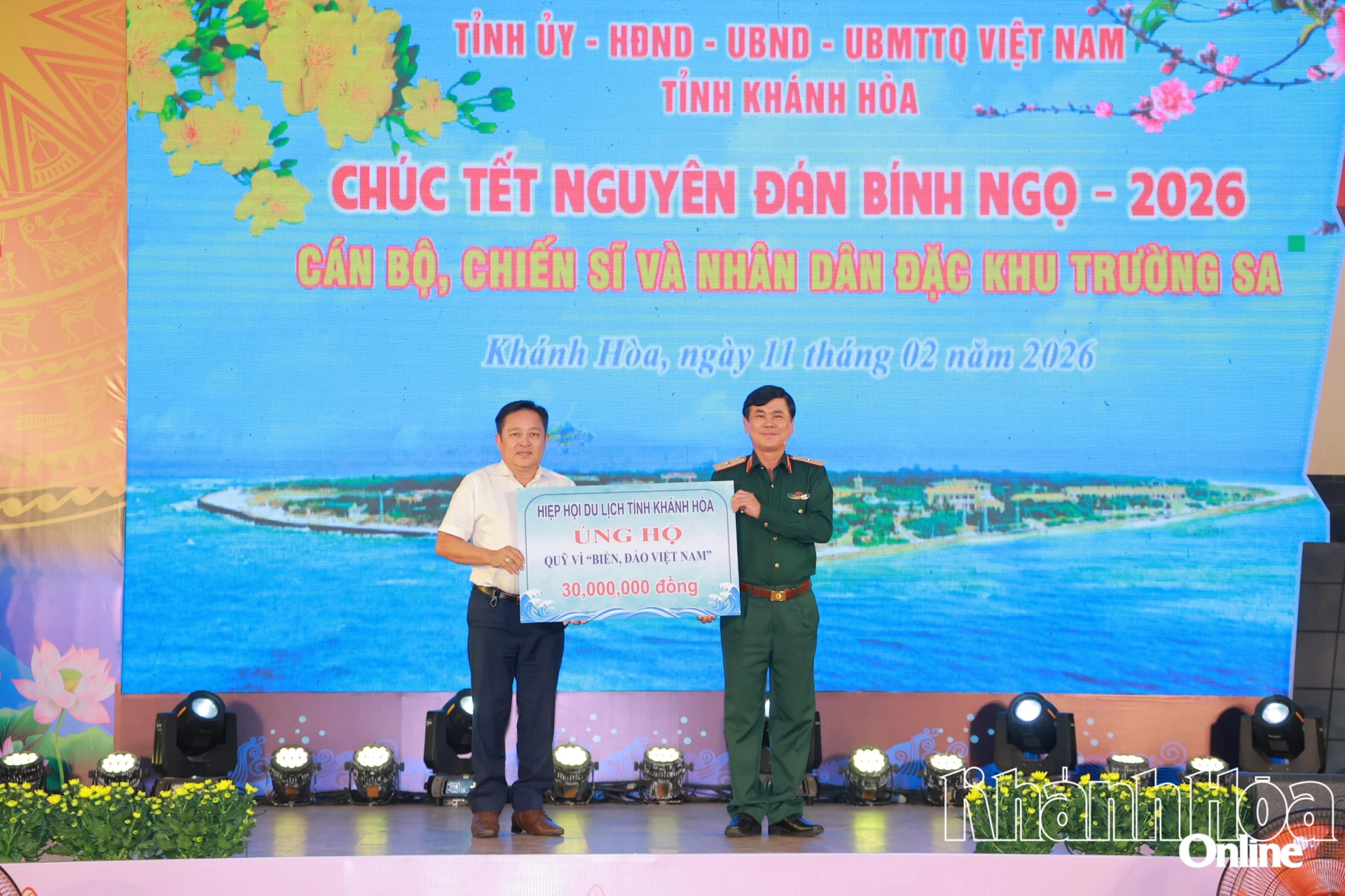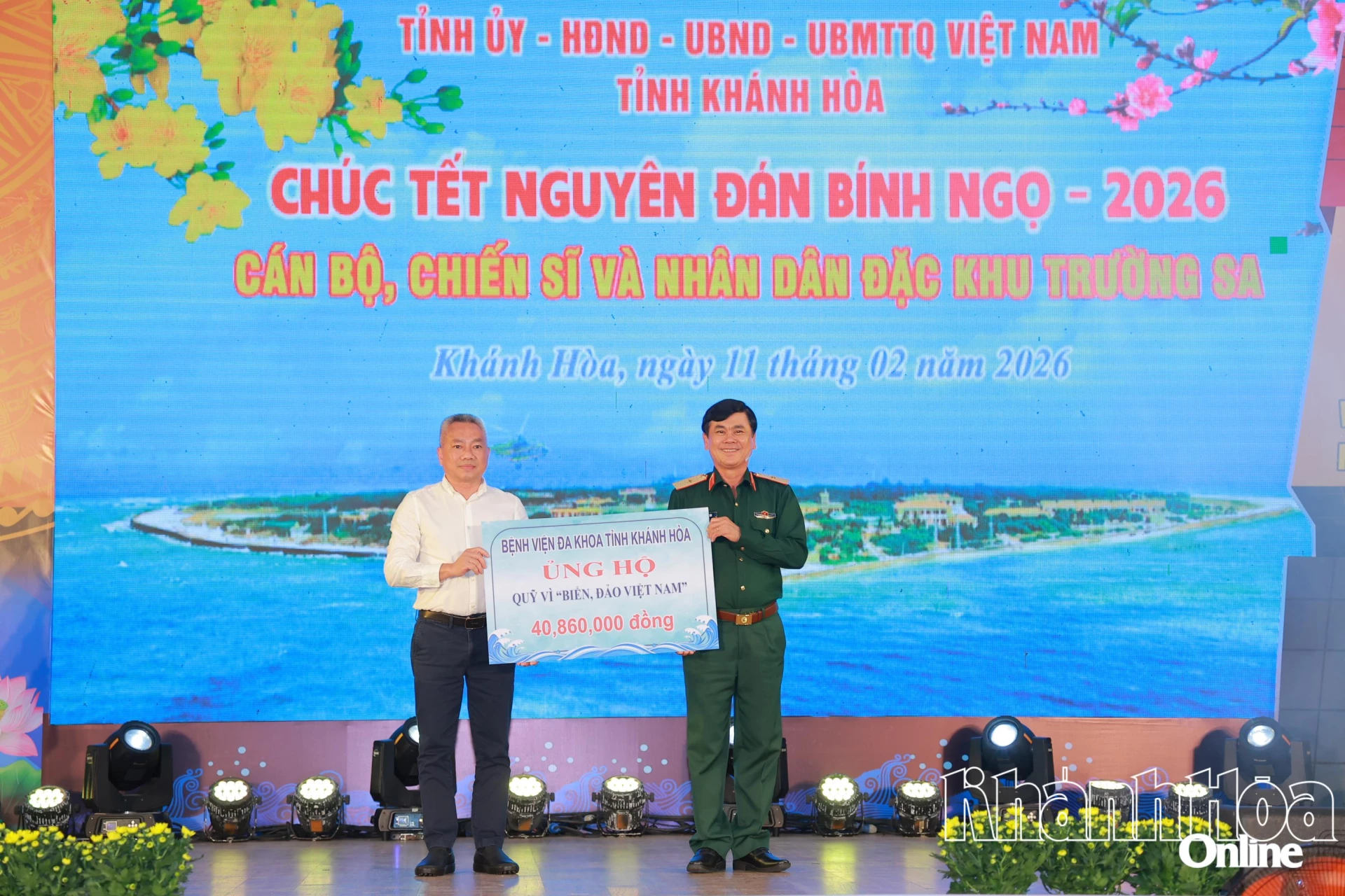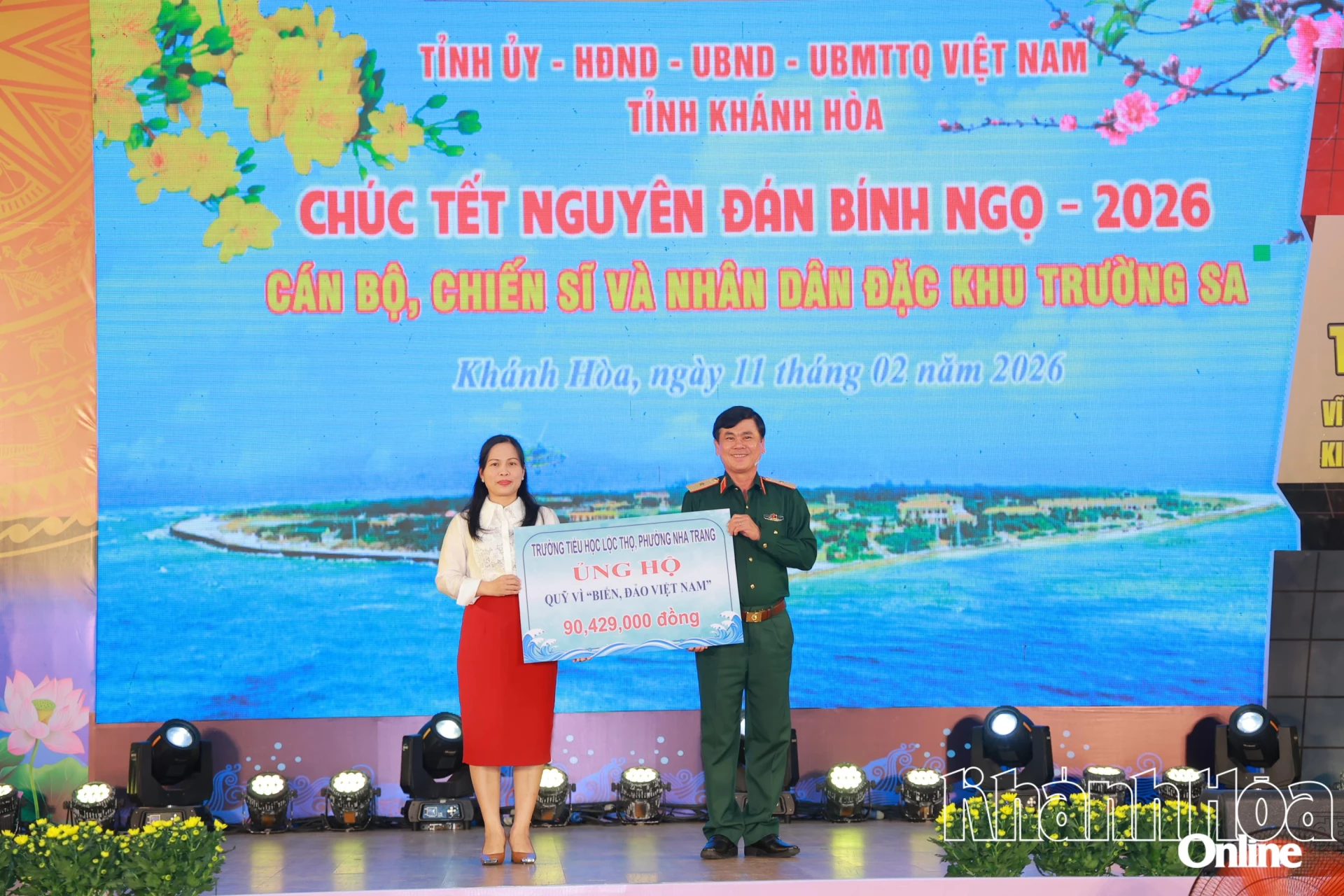 Chiều 11-2, Tỉnh ủy, HĐND, UBND, Ủy ban MTTQ Việt Nam tỉnh Khánh Hòa tổ chức cầu truyền hình trực tuyến chúc Tết Nguyên đán Bính Ngọ 2026 đến cán bộ, chiến sĩ và Nhân dân đặc khu Trường Sa. Đến dự chương trình tại điểm cầu phường Nha Trang có các đồng chí: Nghiêm Xuân Thành - Ủy viên Trung ương Đảng, Bí thư Tỉnh ủy; Trần Phong - Ủy viên Trung ương Đảng, Phó Bí thư Tỉnh ủy, Chủ tịch UBND tỉnh; Hồ Xuân Trường - Ủy viên dự khuyết Trung ương Đảng, Phó Bí thư Thường trực Tỉnh ủy; Lâm Đông - Phó Bí thư Tỉnh ủy, Chủ tịch HĐND tỉnh; Nguyễn Khắc Hà - Phó Bí thư Tỉnh ủy, Chủ tịch Ủy ban MTTQ Việt Nam tỉnh; Thượng tá Bùi Xuân Bình - Bí thư Đảng ủy, Chính ủy Vùng 4 Hải quân; các đồng chí trong Ban Thường vụ Tỉnh ủy; Thường trực HĐND tỉnh, lãnh đạo UBND tỉnh; lãnh đạo các sở, ban, ngành, địa phương, doanh nghiệp; cán bộ, chiến sĩ đang công tác tại Vùng 4 Hải quân; thân nhân cán bộ, chiến sĩ, người dân đang sinh sống, công tác ở đặc khu Trường Sa. Cầu truyền hình được kết nối trực tuyến đến các điểm cầu ở đảo Trường Sa, đảo Sinh Tồn, đảo Đá Tây.