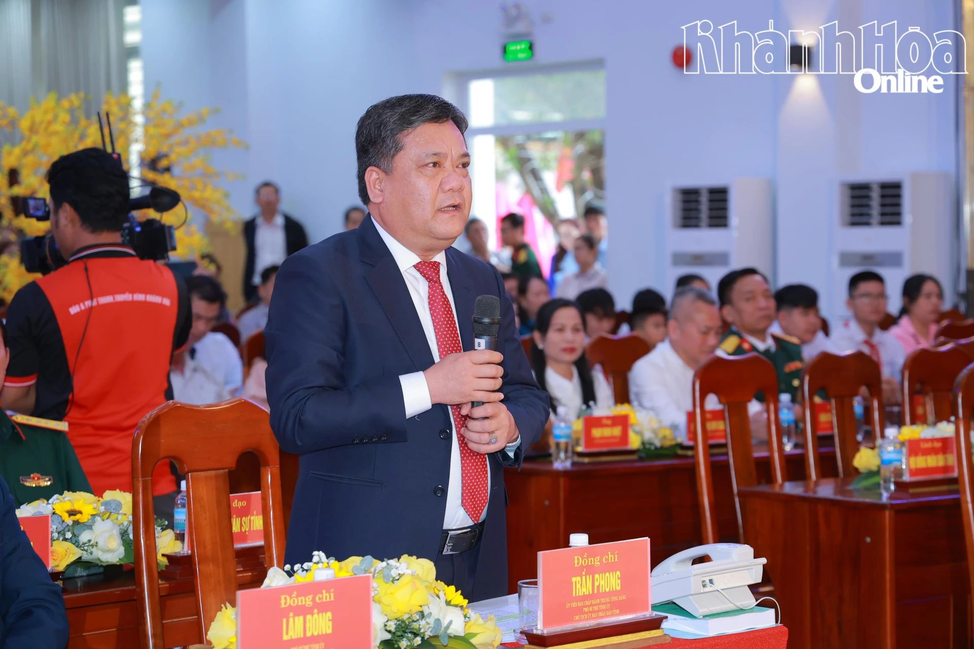 Đồng chí Trần Phong chia sẻ những thông tin về tình hình phát triển của tỉnh, đồng thời gửi lời động viên đến cán bộ, chiến sĩ, Nhân dân đặc khu Trường Sa.