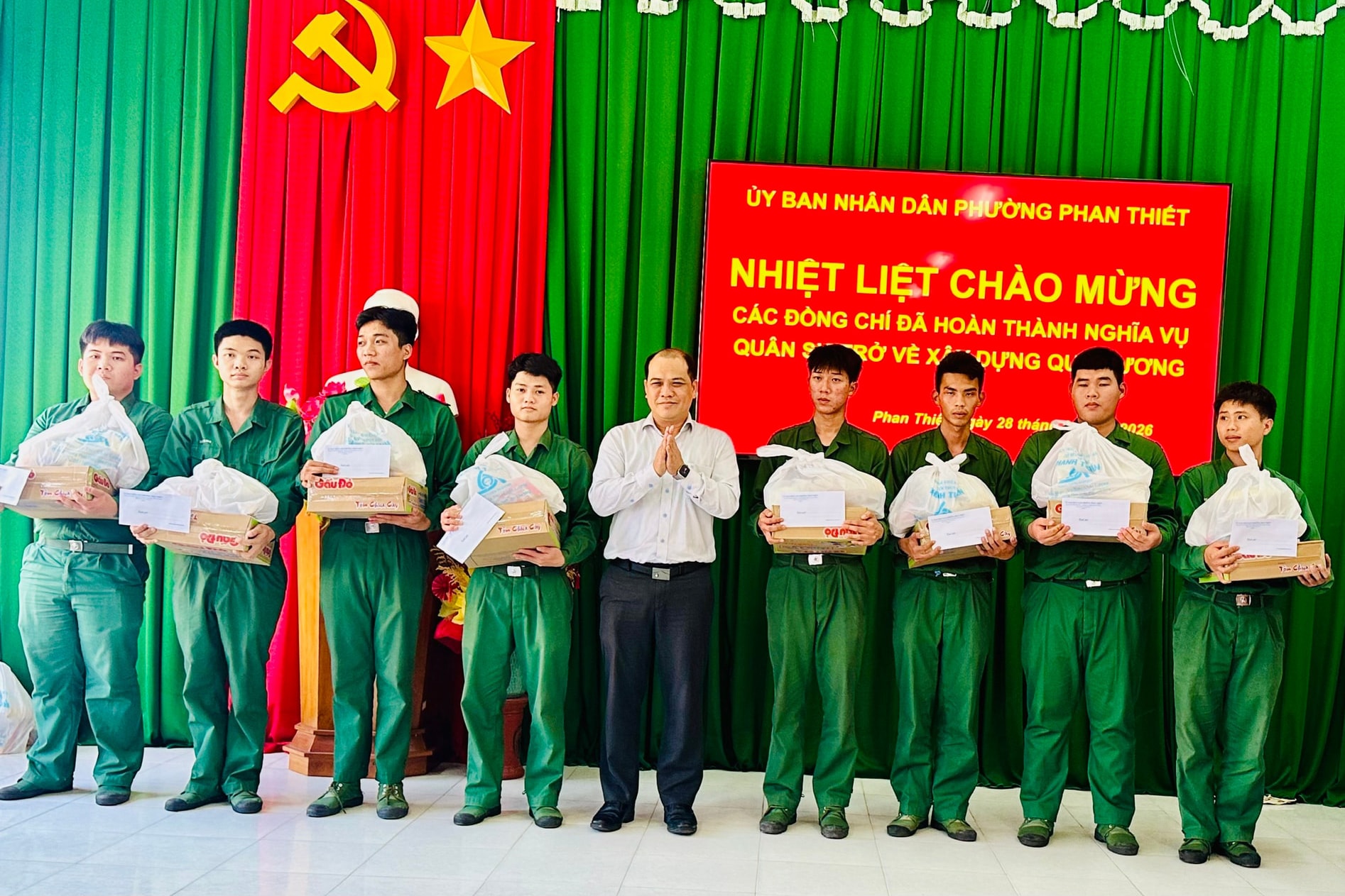 Những ngày cuối tháng 1/2026, nhiều xã, phường trong tỉnh đều tổ chức buổi gặp mặt, đón tiếp các quân nhân đã hoàn thành xuất sắc nghĩa vụ quân sự. Những cái ôm ấm áp, những món quà nghĩa tình, cùng lời thăm hỏi ân cần từ lãnh đạo địa phương càng khiến các chiến sĩ vui mừng, cảm động. Ghi nhận tại Ban Chỉ huy Quân sự phường Phan Thiết vào ngày 28/1, buổi đón tiếp 47 hạ sĩ quan - binh sĩ xuất ngũ năm 2026 được tổ chức trang nghiêm, long trọng. Đó là các chiến sĩ nhập ngũ vào tháng 2/2024 tại các đơn vị như Lữ đoàn 101/ Bộ Tư lệnh Vùng 4 Quân chủng Hải quân, Đại đội Bộ binh (Phú Quý), các Đồn Biên phòng Mũi Né, Hòa Minh, Thanh Hải…