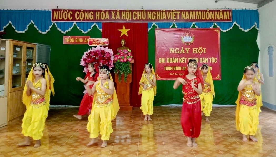 Các cháu thiếu nhi biểu diễn văn nghệ phục vụ Ngày hội Đại Đoàn kết toàn dân tộc thôn Bình An
