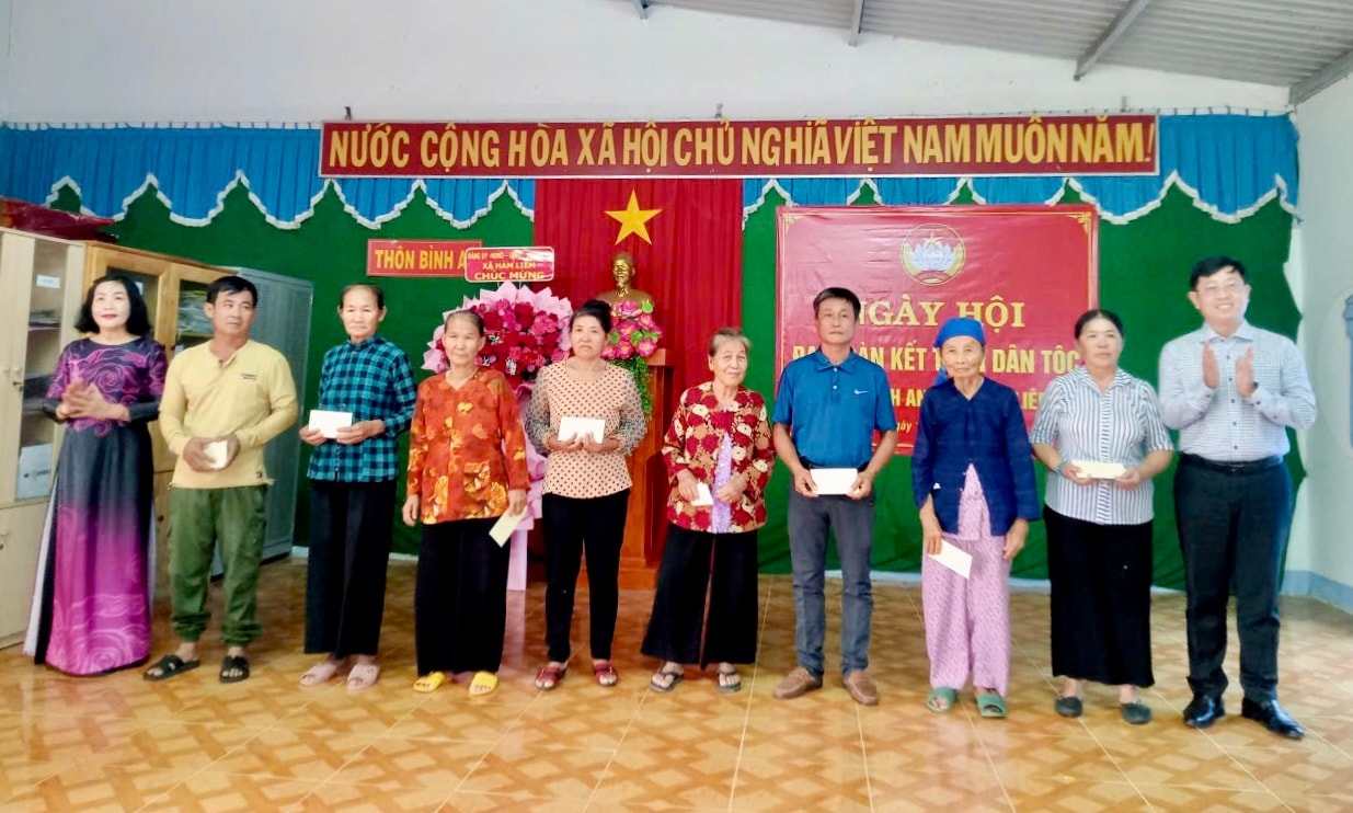 Dịp này, đồng chí Nguyễn Hữu Thông thay mặt Tỉnh ủy - HĐND - UBND - Ủy ban MTTQ Việt Nam tỉnh Lâm Đồng trao 10 phần quà cho các hộ có hoàn cảnh khó khăn trong thôn, mỗi phần trị giá 1 triệu đồng.