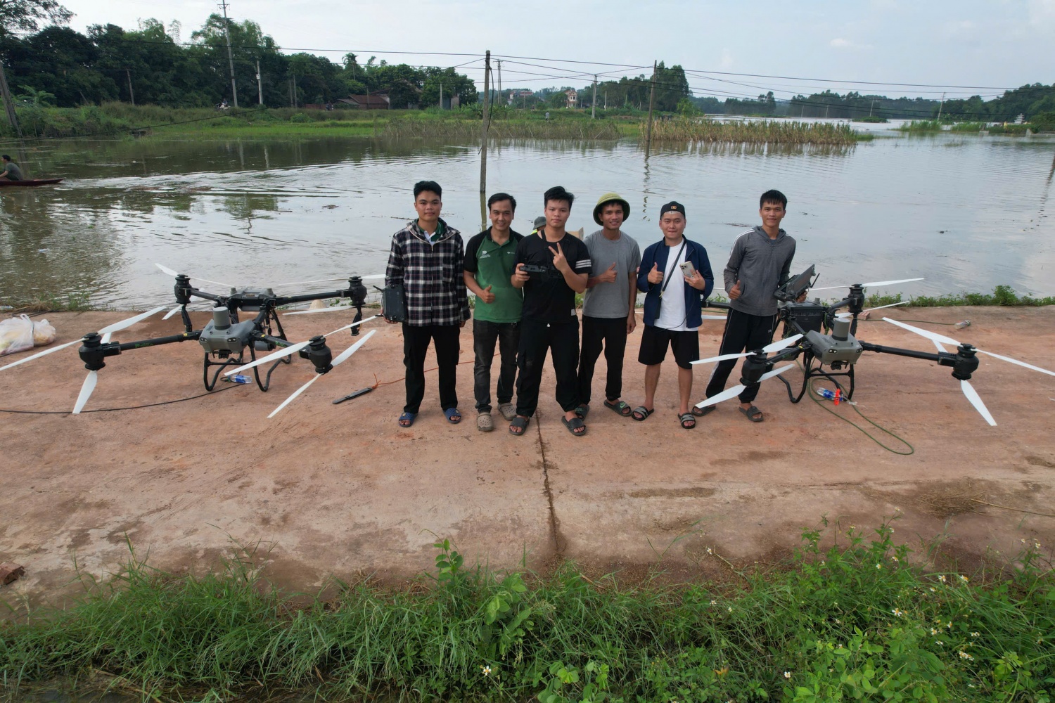 Ngay hôm sau, họ lên đường. Người đi máy bay tăng cường nhanh ra Bắc để đến vùng lũ, người chạy xe cá nhân. Điểm đến đầu tiên là xã Hoàng Vân (Bắc Giang), nơi nước dâng ngập tới mái nhà. Trong cốp xe là pin sạc, cánh quạt dự phòng, bộ điều khiển, và những chiếc drone nông nghiệp T50 loại có thể chở hàng nặng tới 50kg. Đạt nhớ lại: “Bọn em vừa tới đã được chính quyền xã hướng dẫn khu vực cần hỗ trợ. Mọi người rất quý, ai có đồ ăn đều san sẻ, có nhà trống thì cho nhóm nghỉ nhờ”.