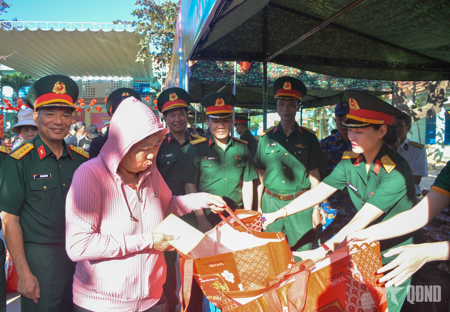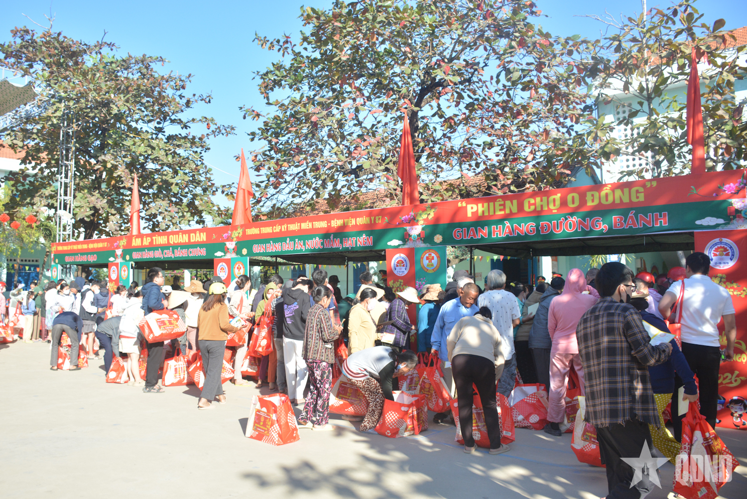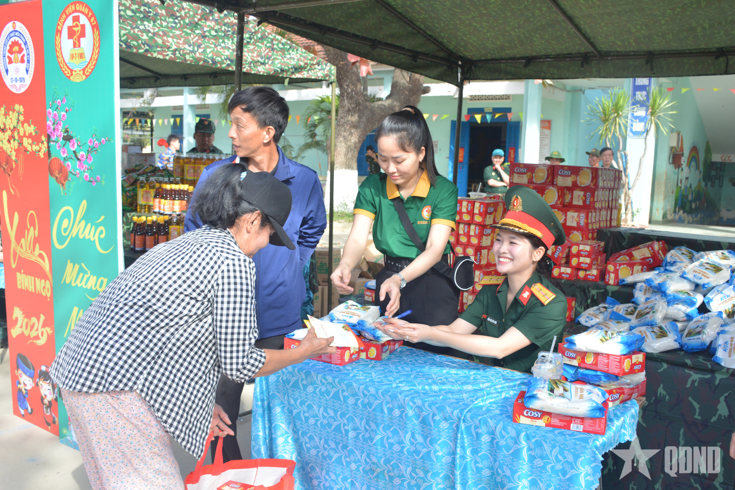 Tại phiên chợ, Ban tổ chức đã trao 550 suất quà, tặng các hộ gia đình thuộc diện chính sách và hoàn cảnh khó khăn. Mỗi suất quà trị giá 500.000 đồng, gồm các nhu yếu phẩm thiết yếu phục vụ sinh hoạt dịp Tết như: Gạo tẻ, gạo nếp, dầu ăn, mì chính, nước mắm, muối, cá, trứng gà… Ngoài ra, Ban tổ chức còn bổ sung rau, củ, quả từ nguồn tăng gia sản xuất của đơn vị nhằm nâng cao chất lượng các phần quà. Các hộ gia đình được nhận quà thông qua phiếu “mua hàng 0 đồng” đã được phát trước, bảo đảm đúng đối tượng và thuận tiện.