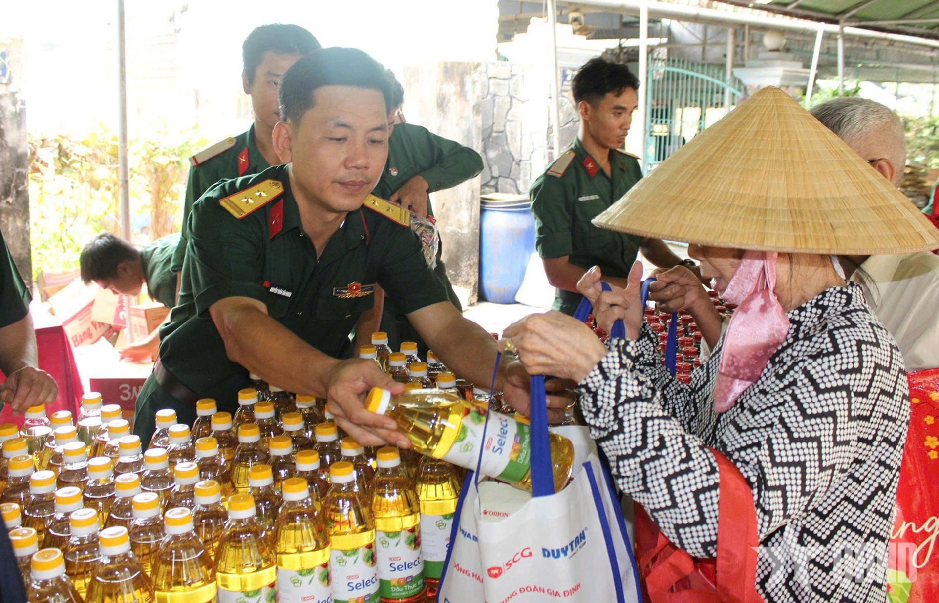 Cán bộ Trung đoàn Gia Định và các nhà hảo tâm tặng quà cho các đối tượng chính sách, hộ nghèo.