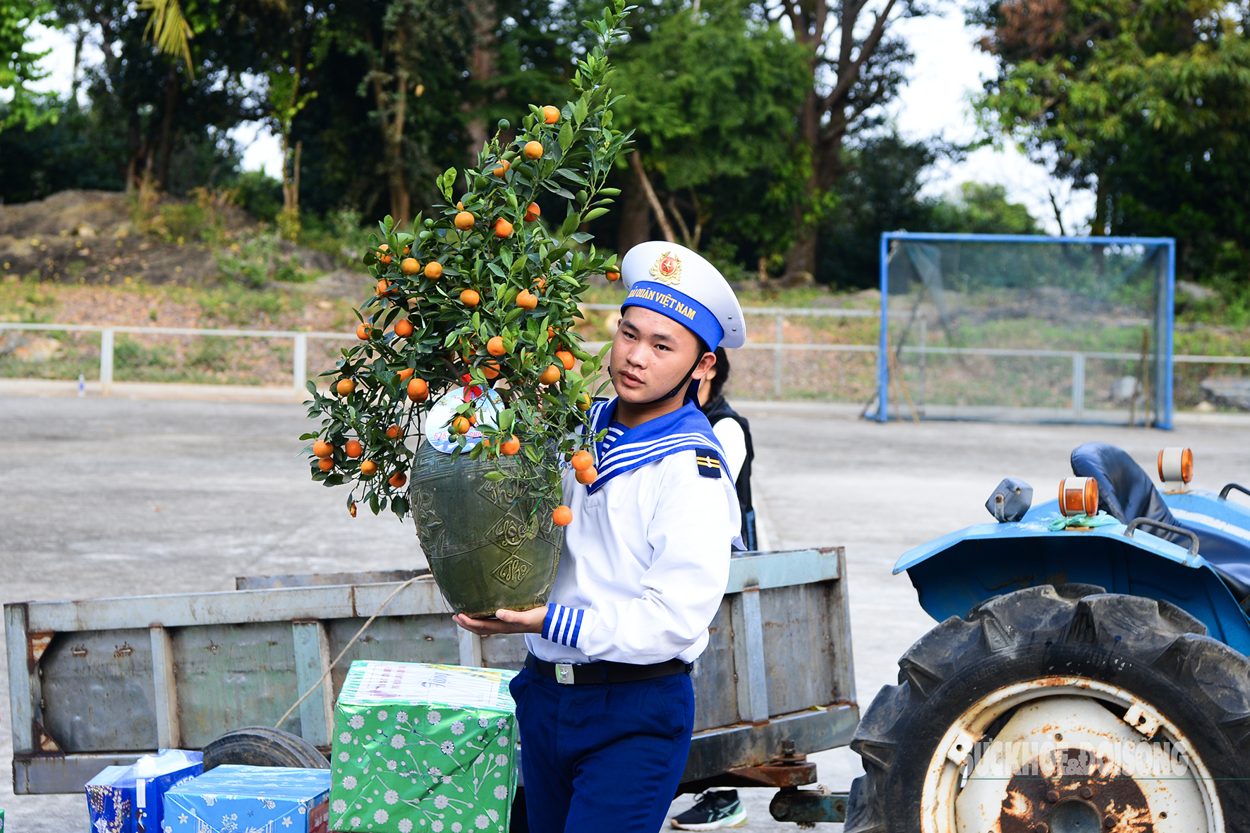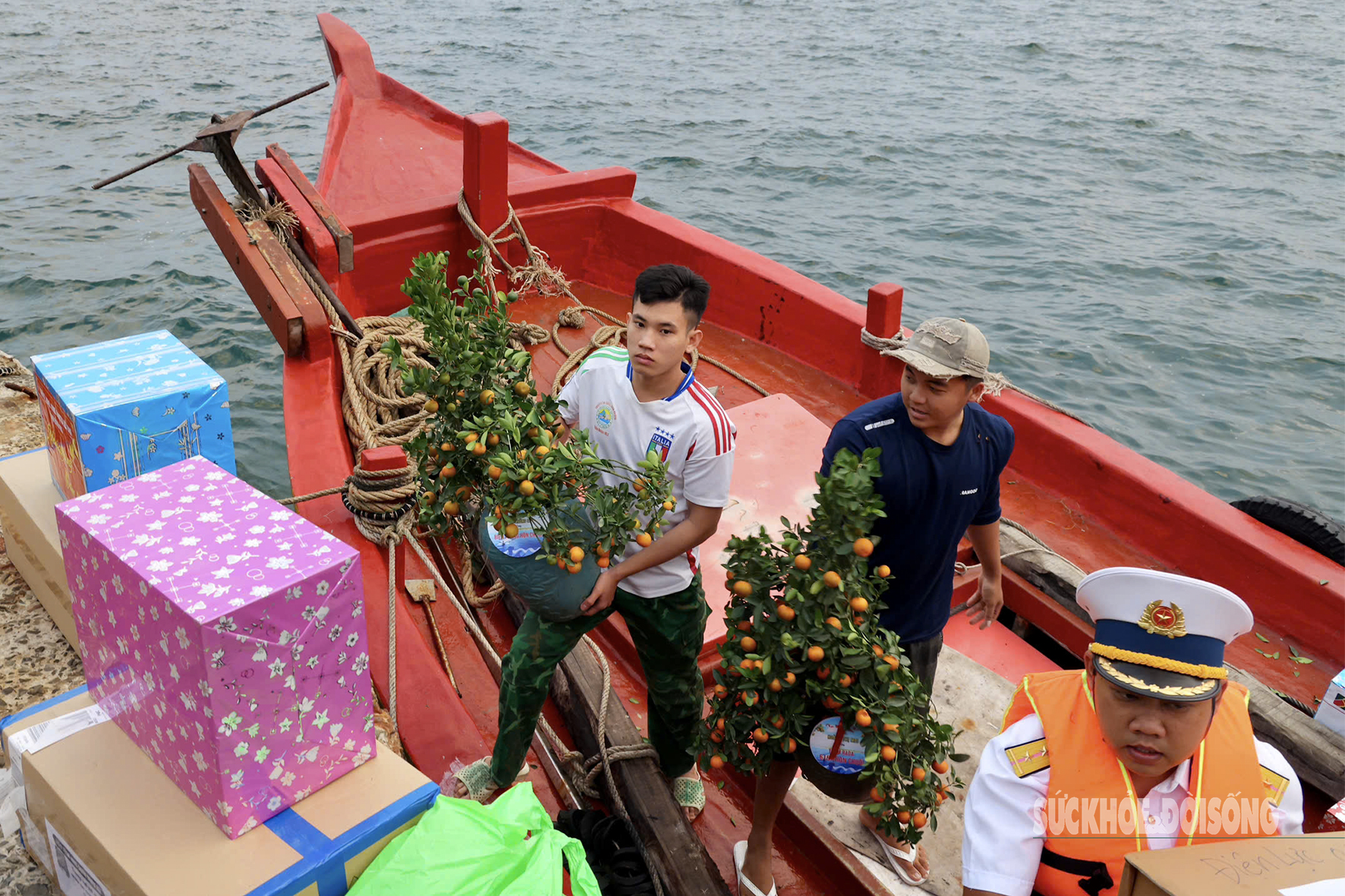 Chiến sĩ Hải quân vận chuyển cây quất và quà Tết từ đất liền ra đảo Hòn Chuối, mang theo không khí xuân ấm áp đến với quân và dân nơi tiền tiêu.