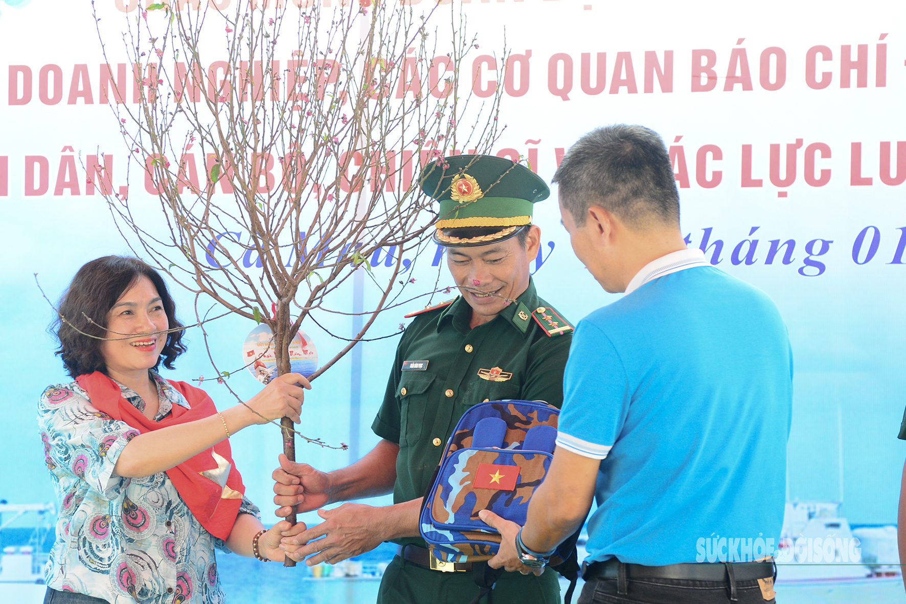 Lãnh đạo đoàn công tác trao quà Tết cho cán bộ, chiến sĩ các lực lượng đang làm nhiệm vụ trên đảo Hòn Chuối, thể hiện sự quan tâm, động viên kịp thời.