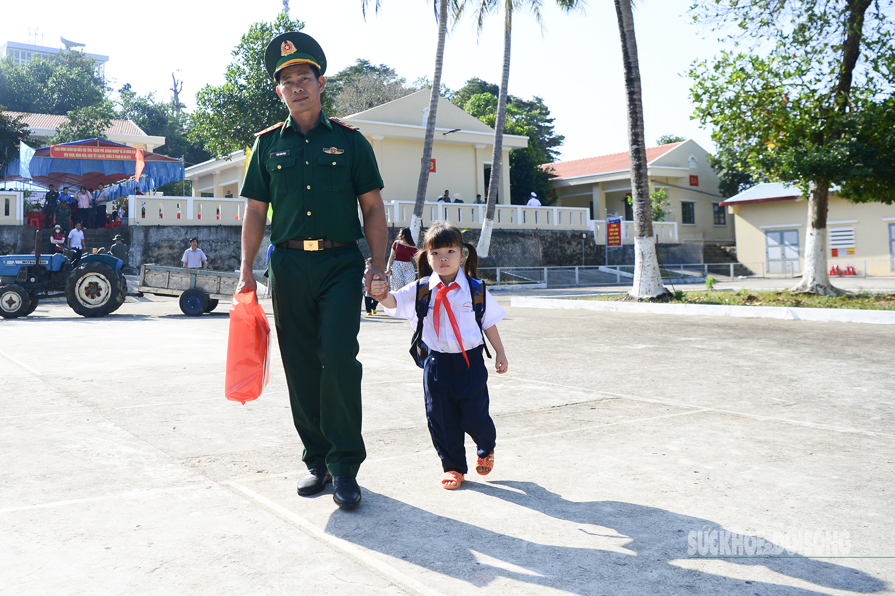 Thầy giáo quân hàm xanh ân cần đưa đón học sinh trên đảo, hình ảnh bình dị nhưng thấm đẫm tình quân dân.