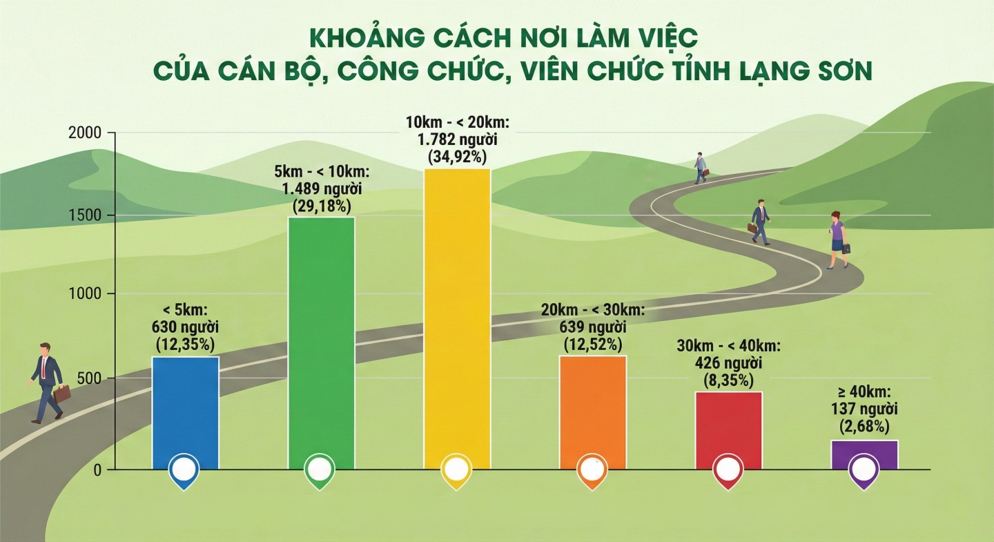 Số liệu rà soát của UBND tỉnh Lạng Sơn vào thời điểm tháng 7/2025 cho thấy sau khi thực hiện tổ chức chính quyền địa phương 2 cấp, cả tỉnh có 5.103 CBCCVC bị tác động do sắp xếp đơn vị hành chính cấp xã. Qua rà soát, có tới gần 35% (gần 1.800 người) phải di chuyển từ 10 km đến dưới 20 km; trên 12,5% (639 người) phải đi làm với khoảng cách từ 20 km đến dưới 30 km; trên 11% (563 người) di chuyển từ 30 km trở lên...