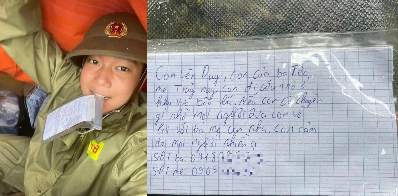 Hình ảnh xúc động của bạn Duy - sinh viên năm 3 trường Đại học Công nghiệp TP đã chạy xe máy ra Nha Trang để đưa bà ngoại đến nơi an toàn rồi sẵn đi cứu trợ. Kể từ đó, trên áo Duy lúc nào cũng đeo một mảnh giấy ghi tên và số điện thoại ba mẹ. Nguồn: @kuromju