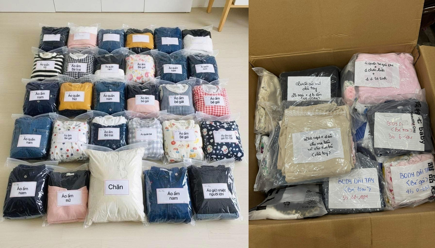 Hình ảnh nhu yếu phẩm được một bạn trẻ xếp gọn gàng, phân loại cùng ghi chú rõ ràng để đến tay người dân khó khăn. Nguồn: @baothi