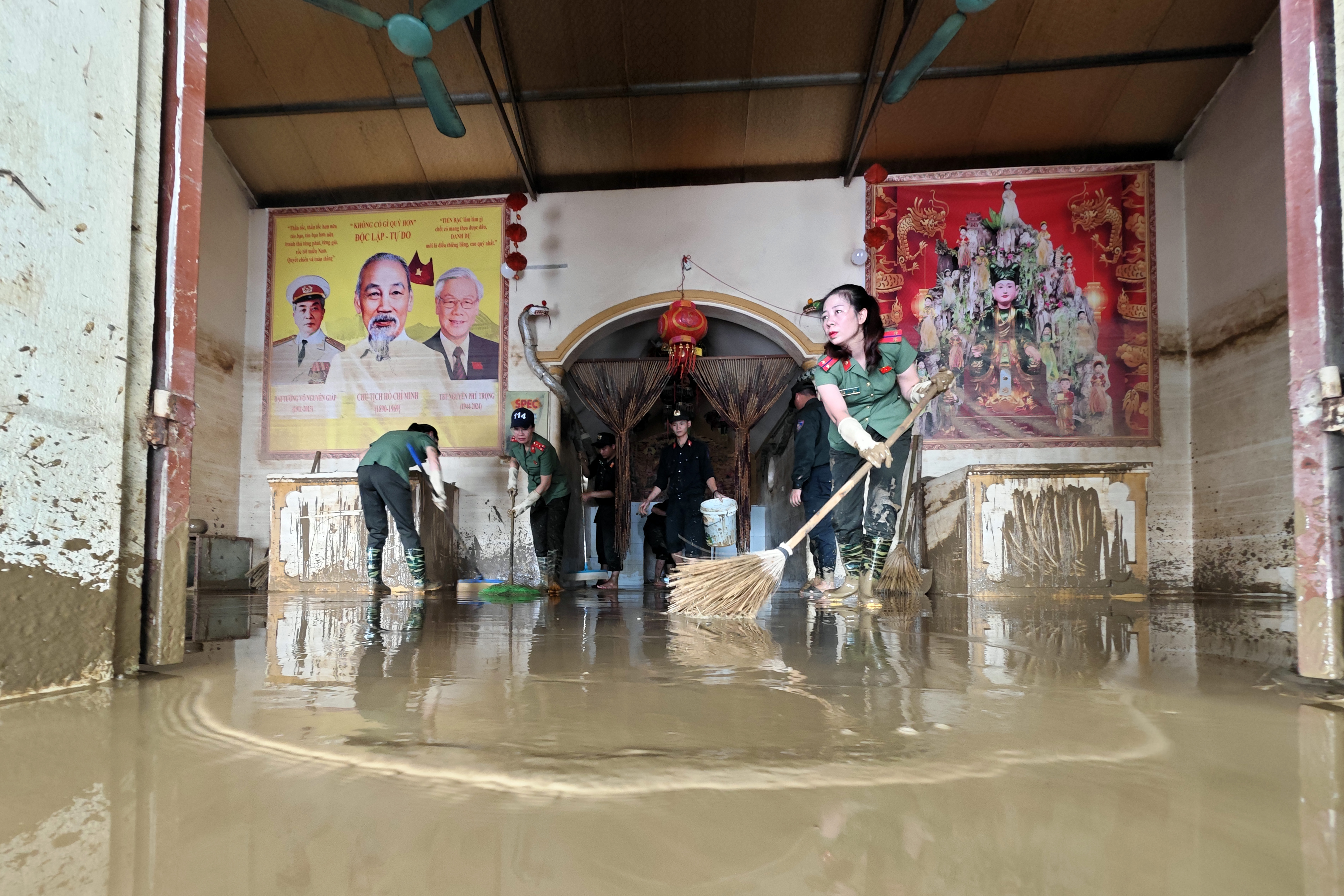 Công an Thủ đô cũng giúp dọn dẹp bùn đất trong cơ sở thờ tự tôn giáo ở thôn Hòa Bình
