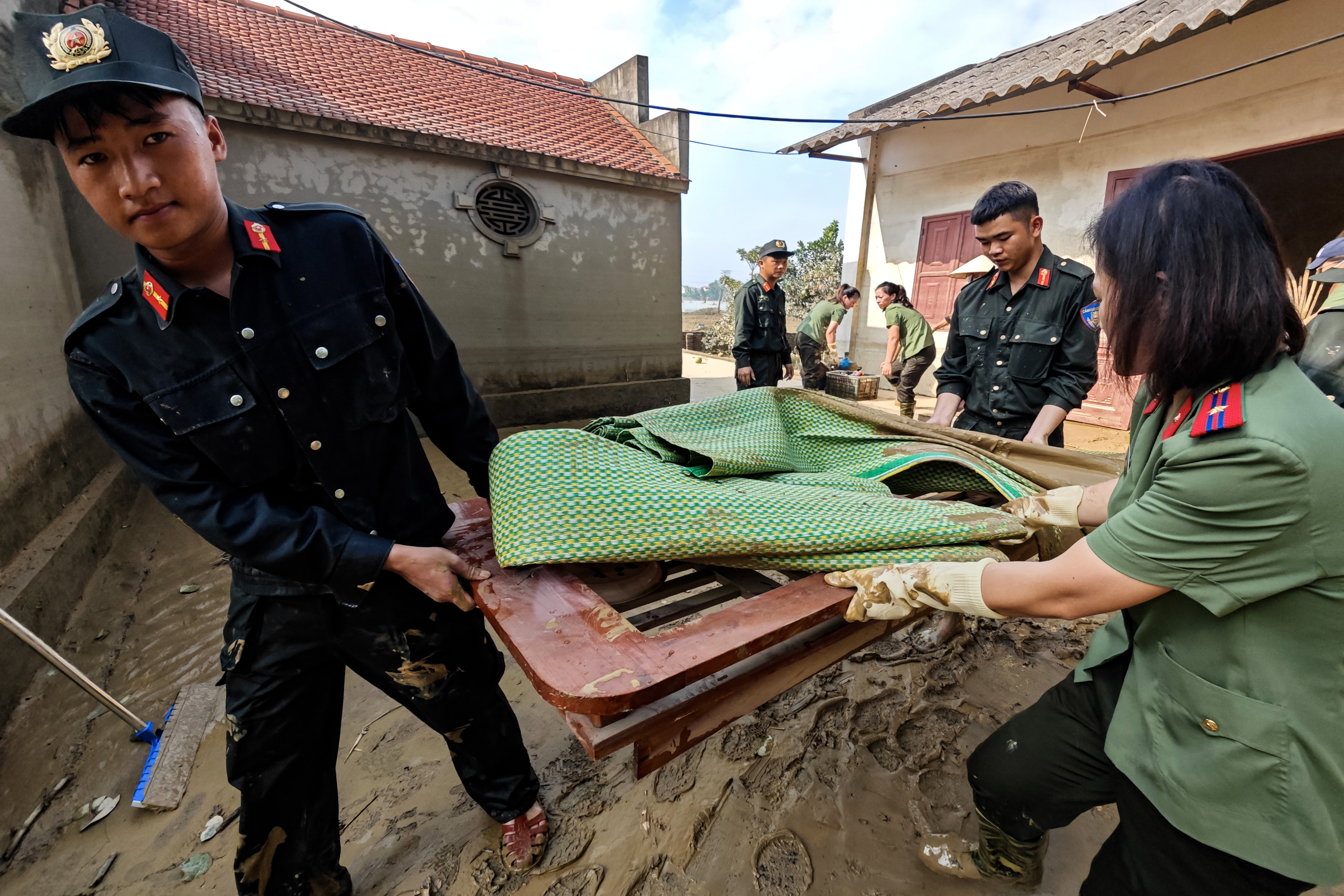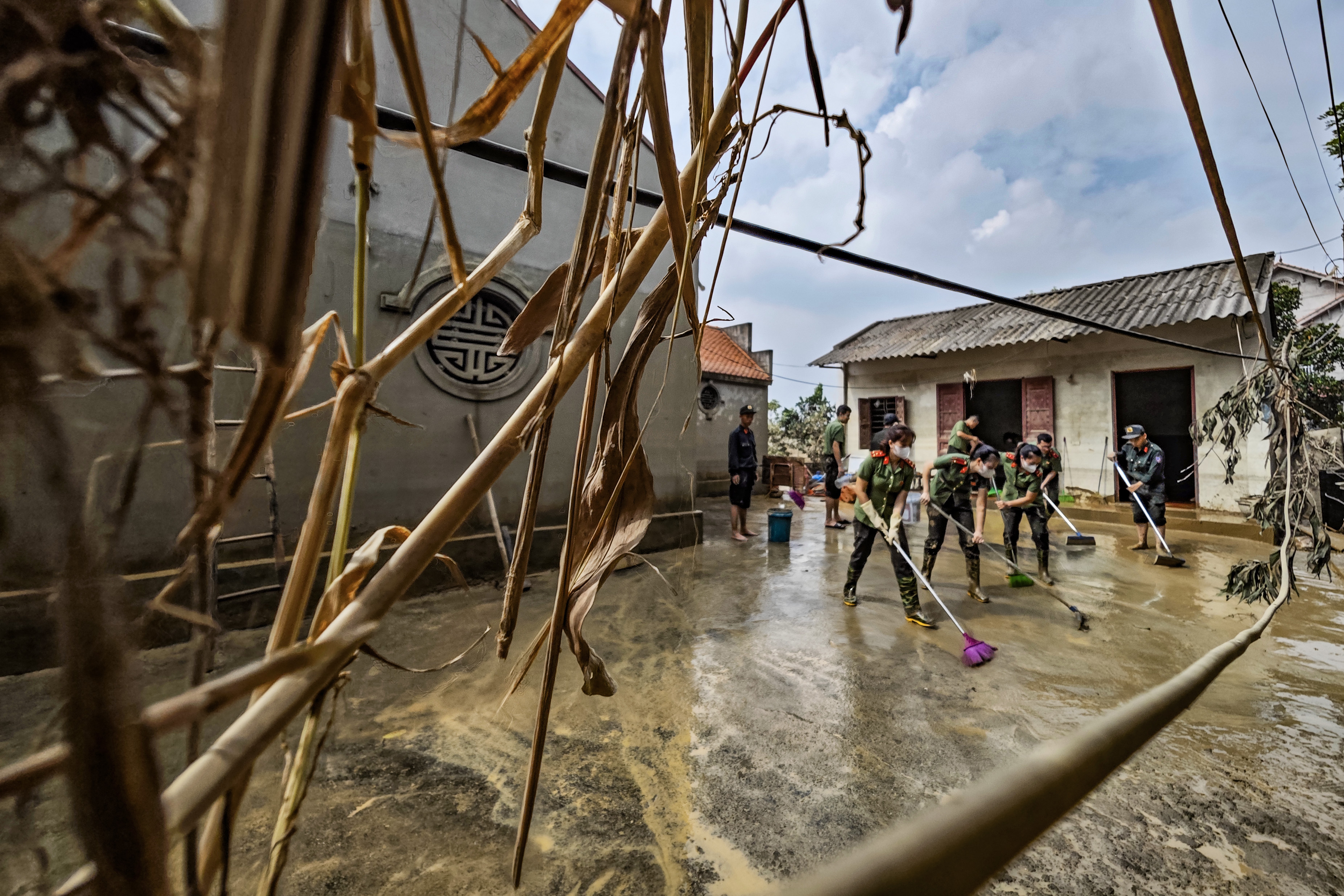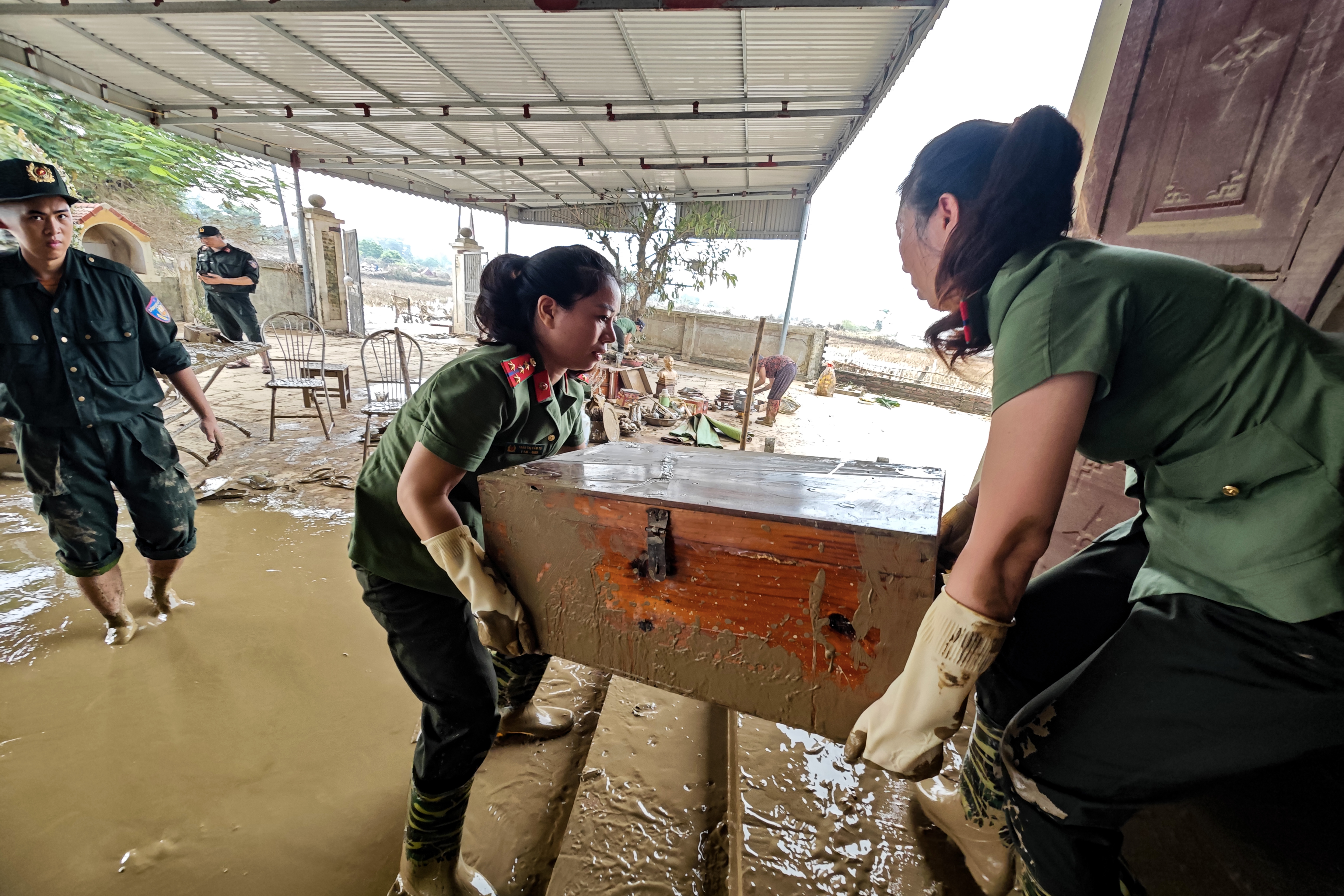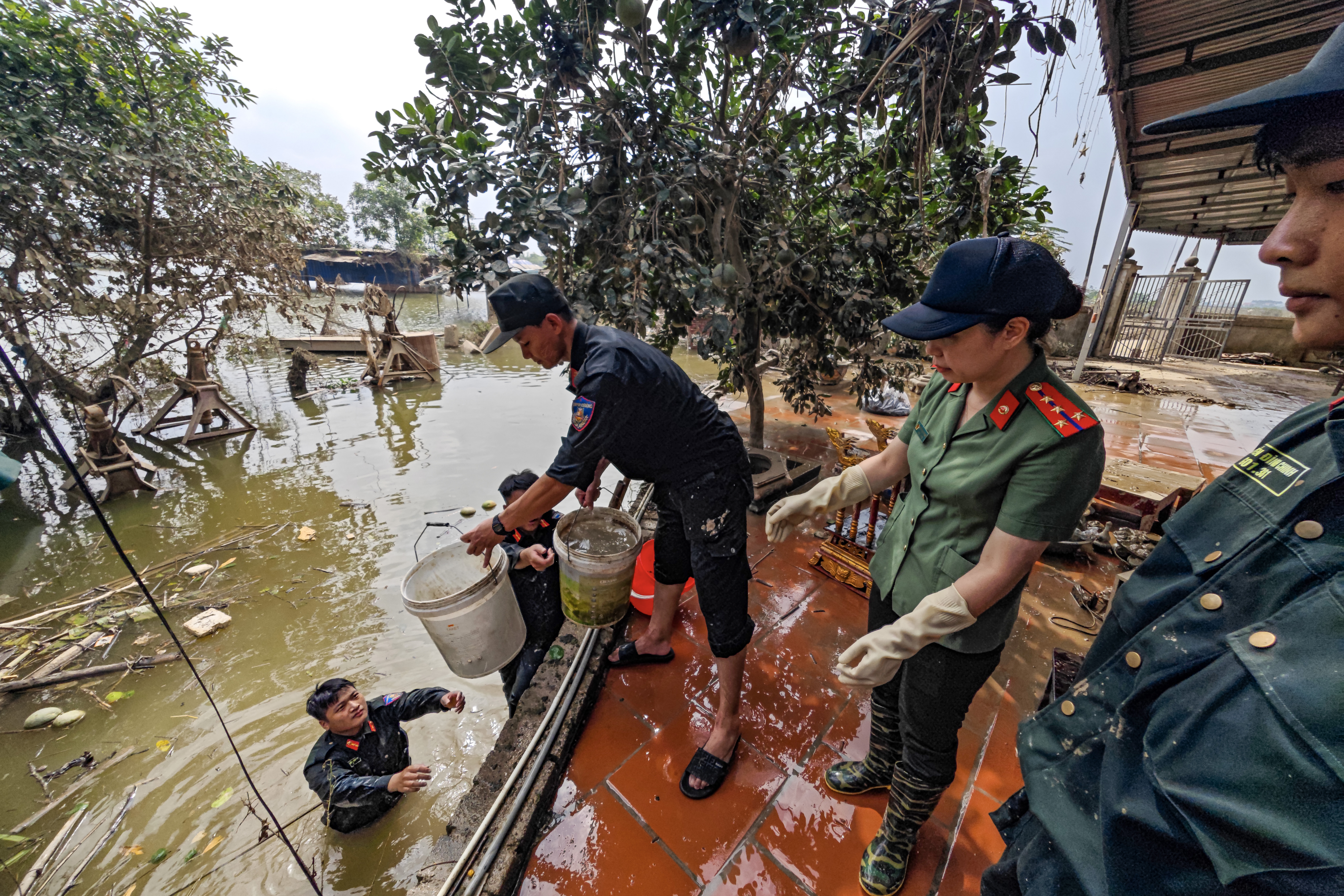 Chỉ còn vài hộ gia đình, công trình tôn giáo phía sát sông còn ngập trong bùn sau khi nước rút. Bệnh viện CATP Hà Nội và lực lượng Cảnh sát cơ động CATP đã bố trí ngay để giúp đỡ