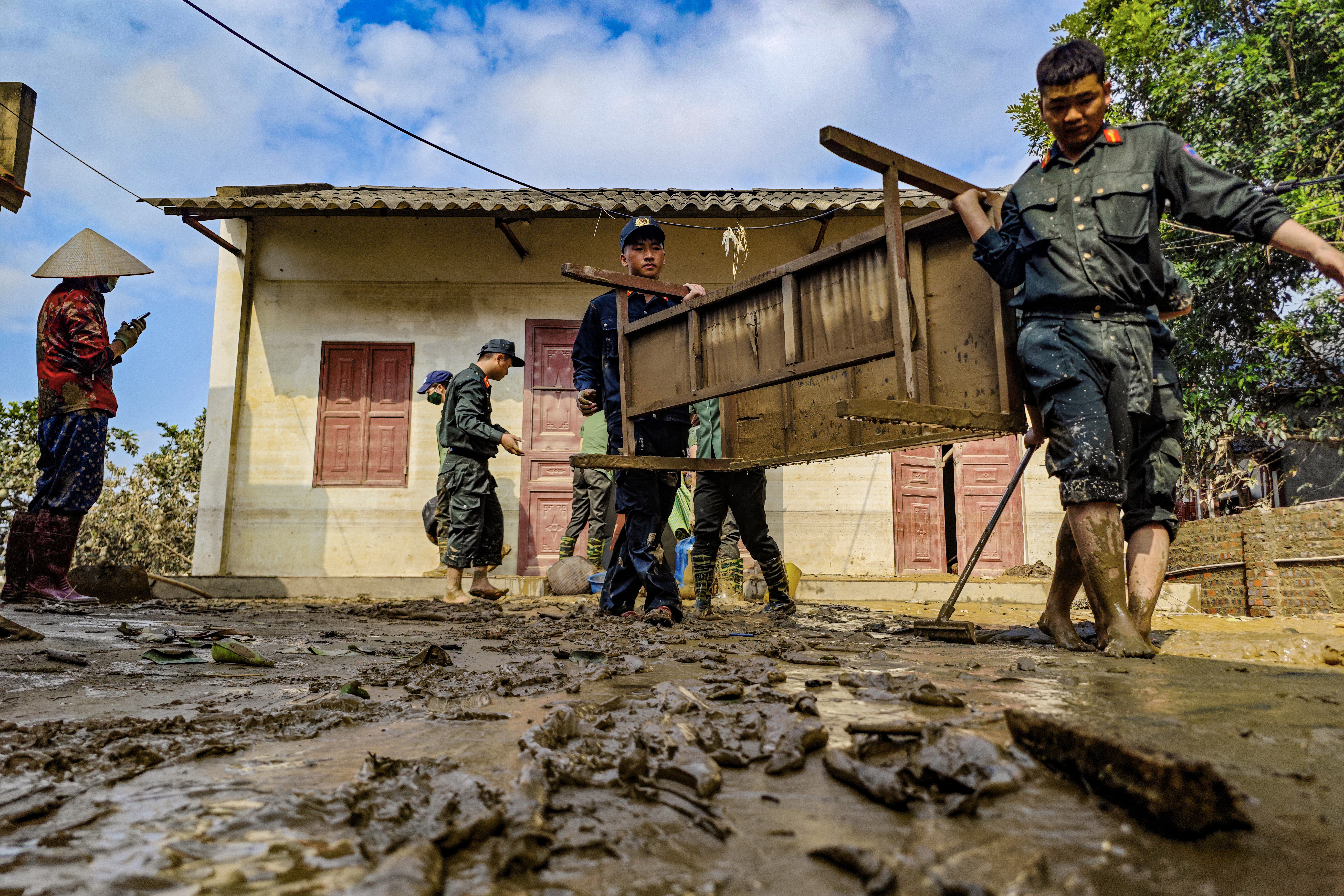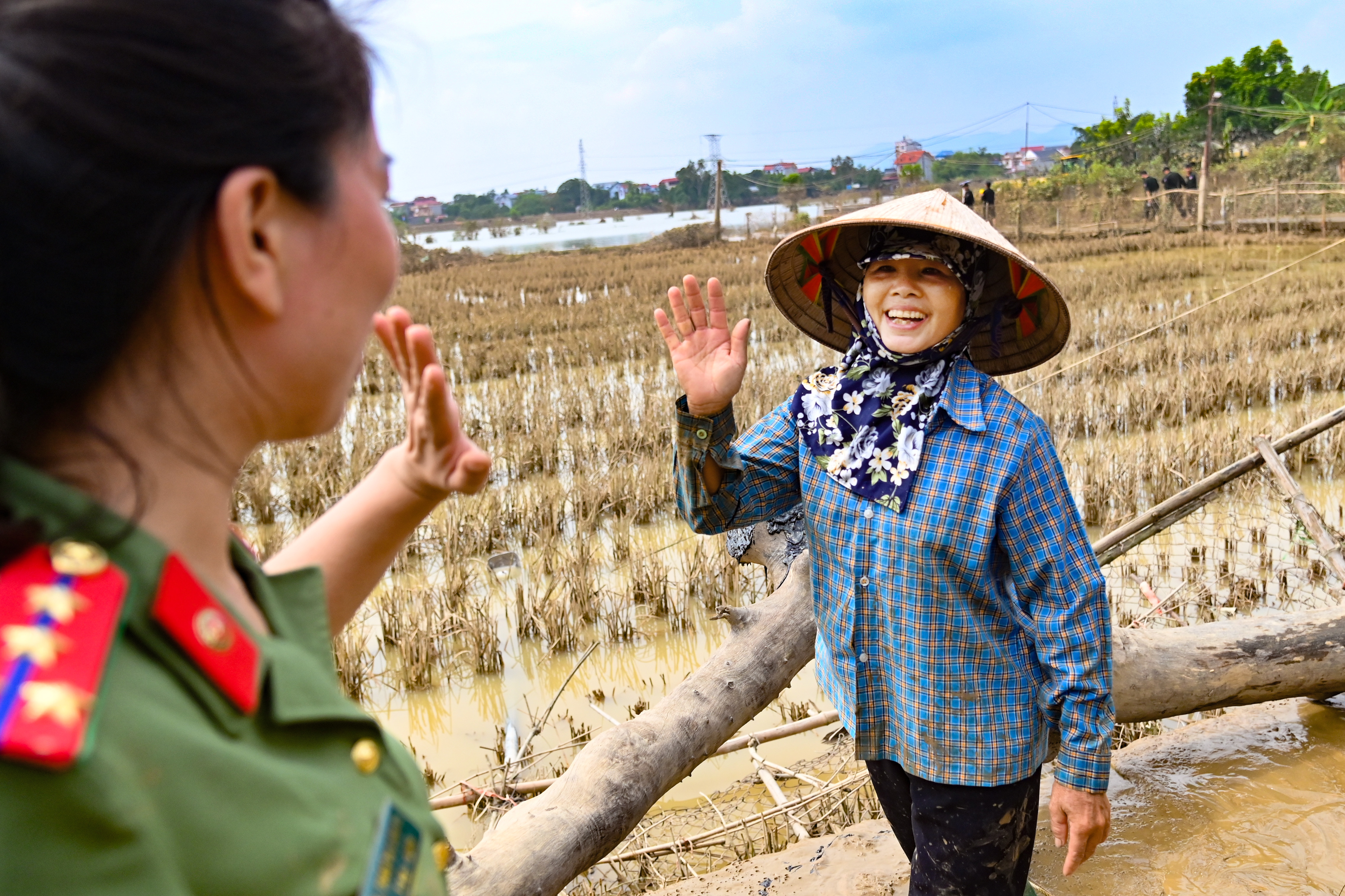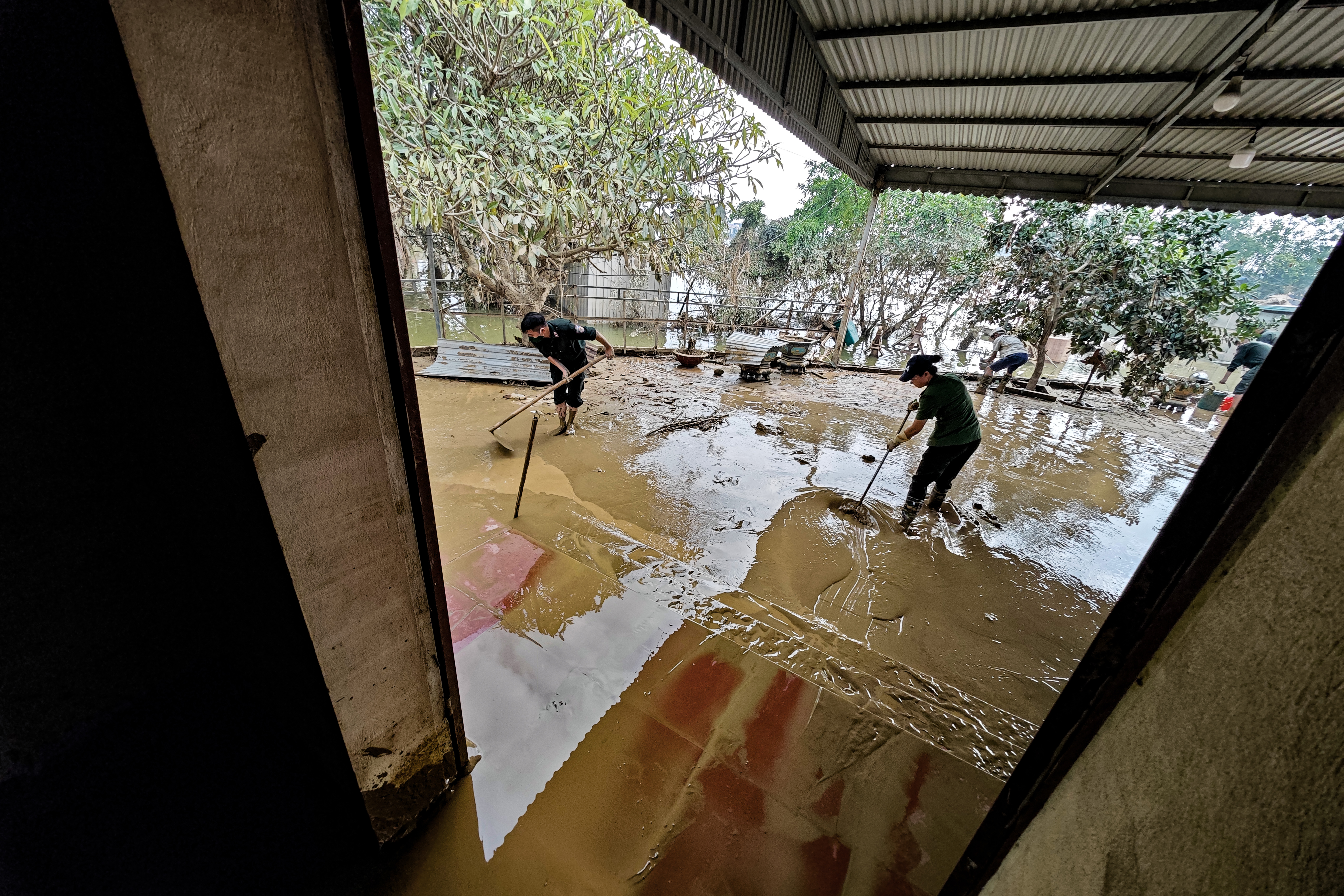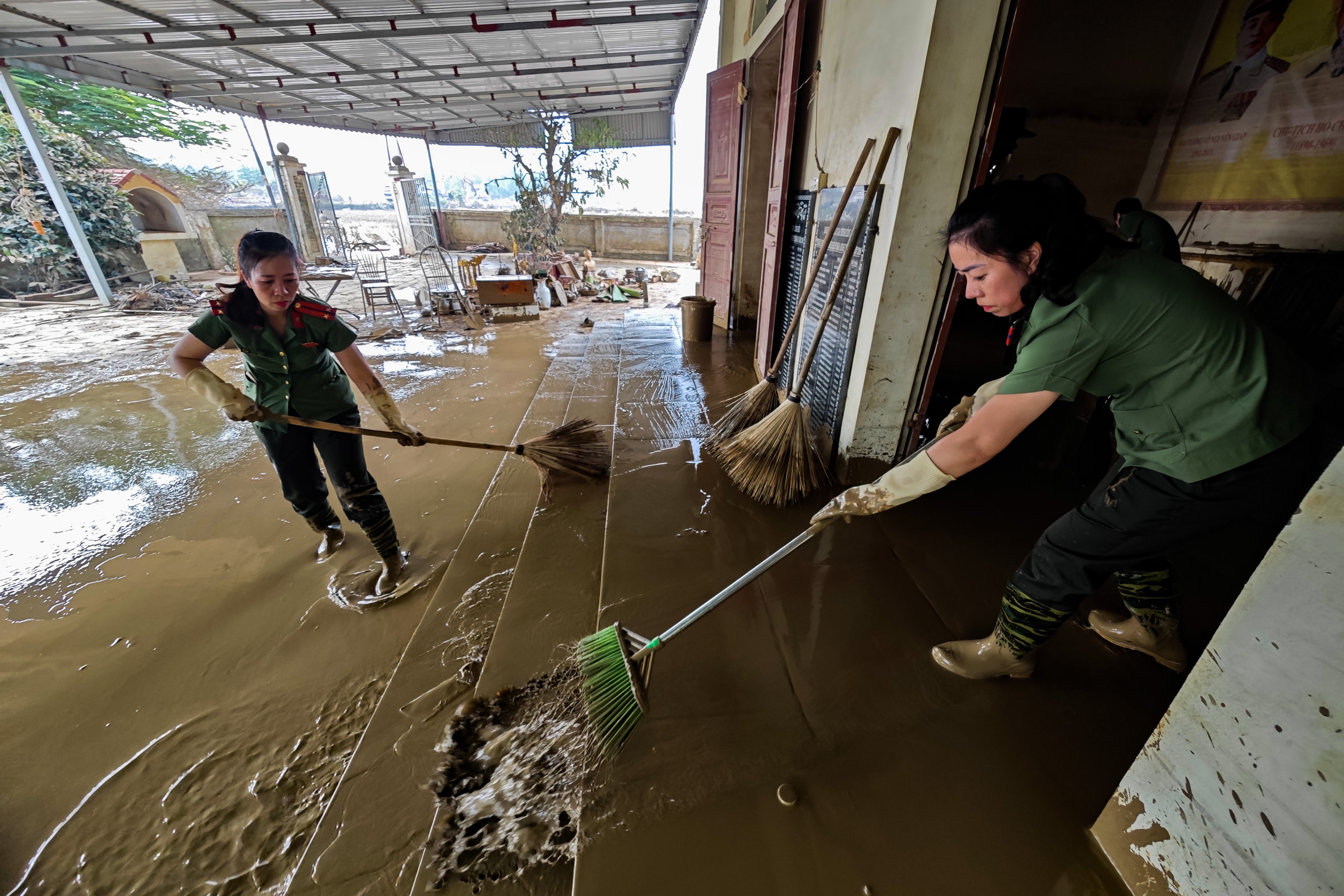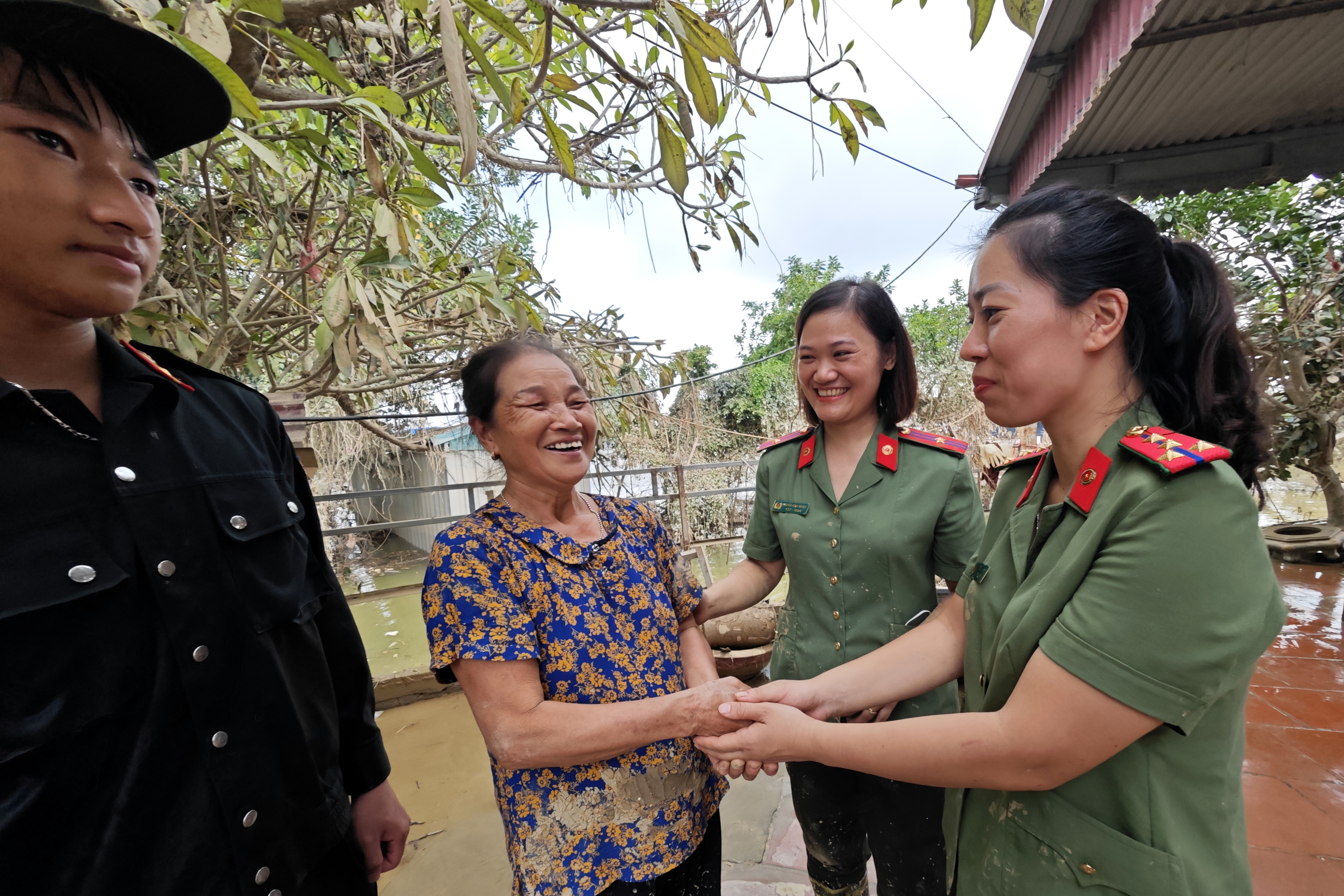 Chỉ còn vài hộ gia đình, công trình tôn giáo phía sát sông còn ngập trong bùn sau khi nước rút. Bệnh viện CATP Hà Nội và lực lượng Cảnh sát cơ động CATP đã bố trí ngay để giúp đỡ