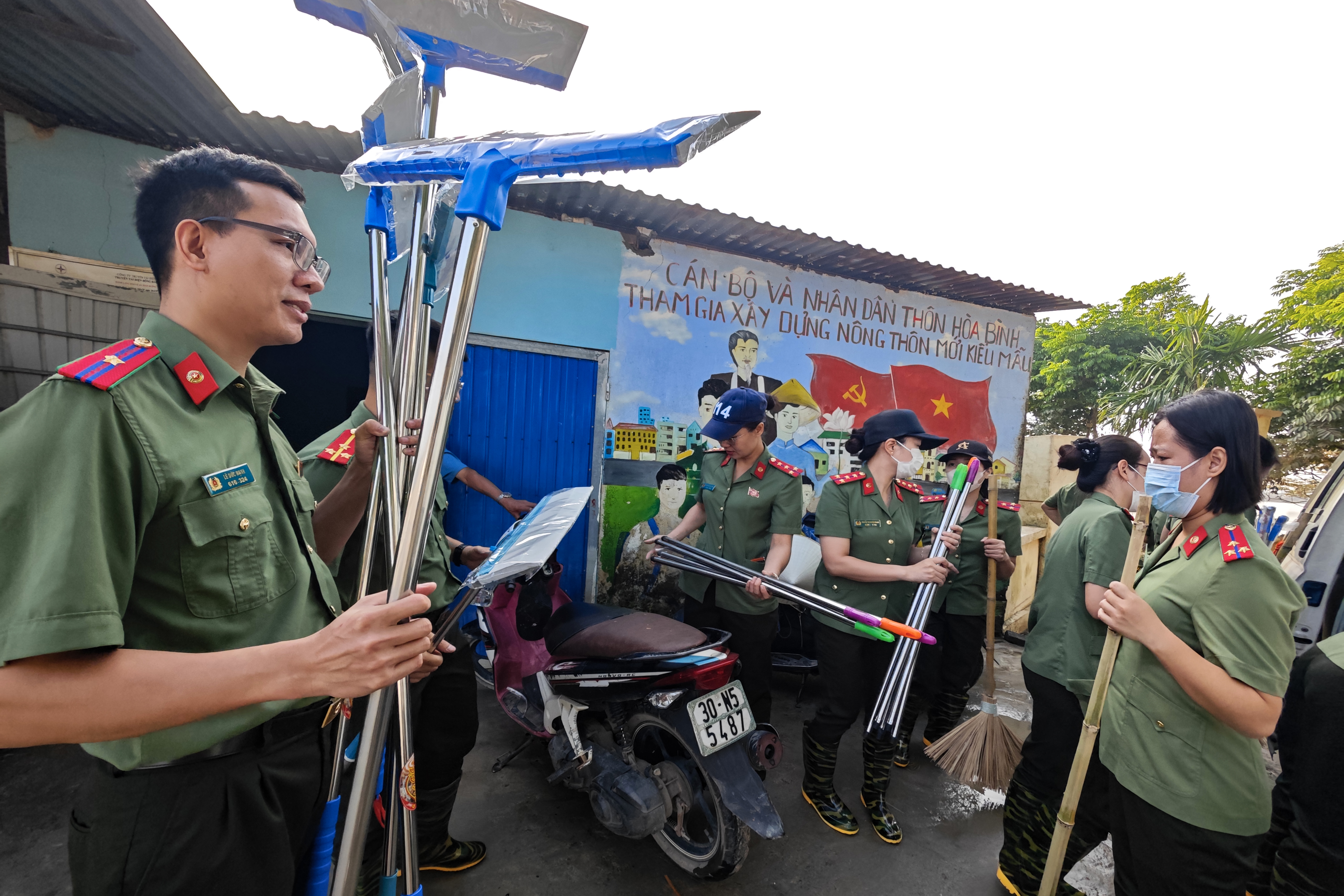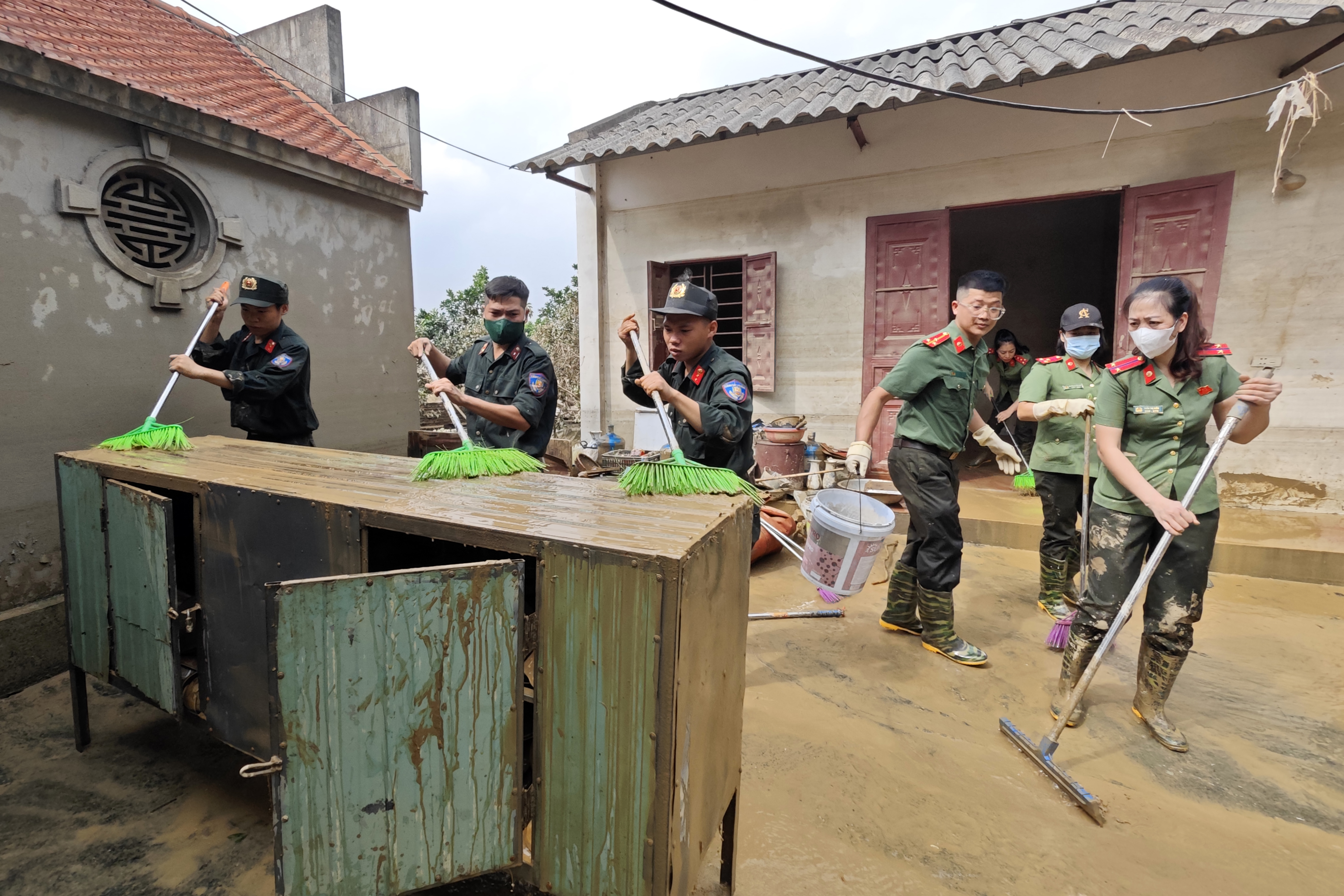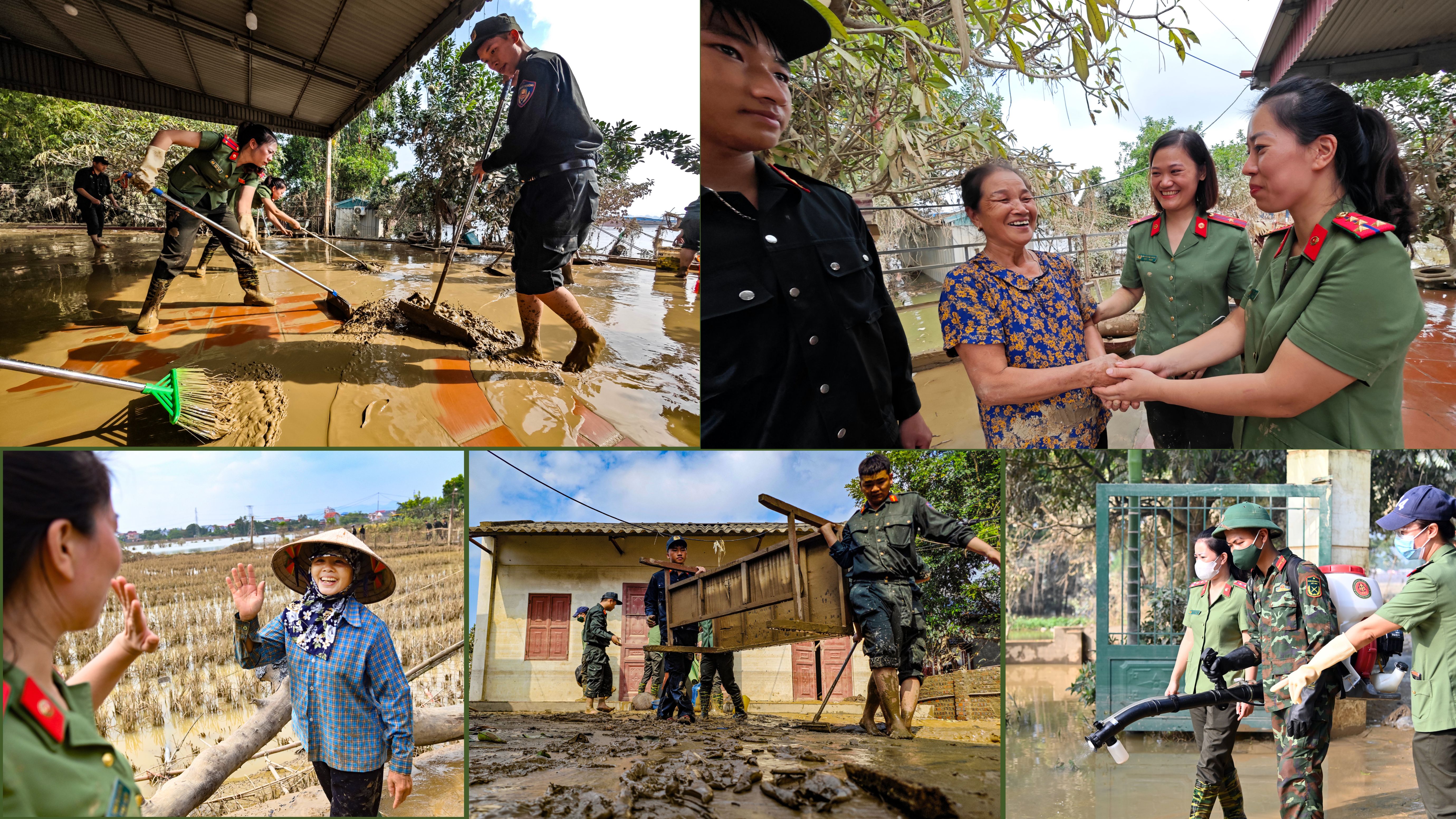 Ấm lòng hình ảnh Công an Thủ đô tất tả dọn bùn giúp dân ven sông xã Trung Giã sau lũ lớn
