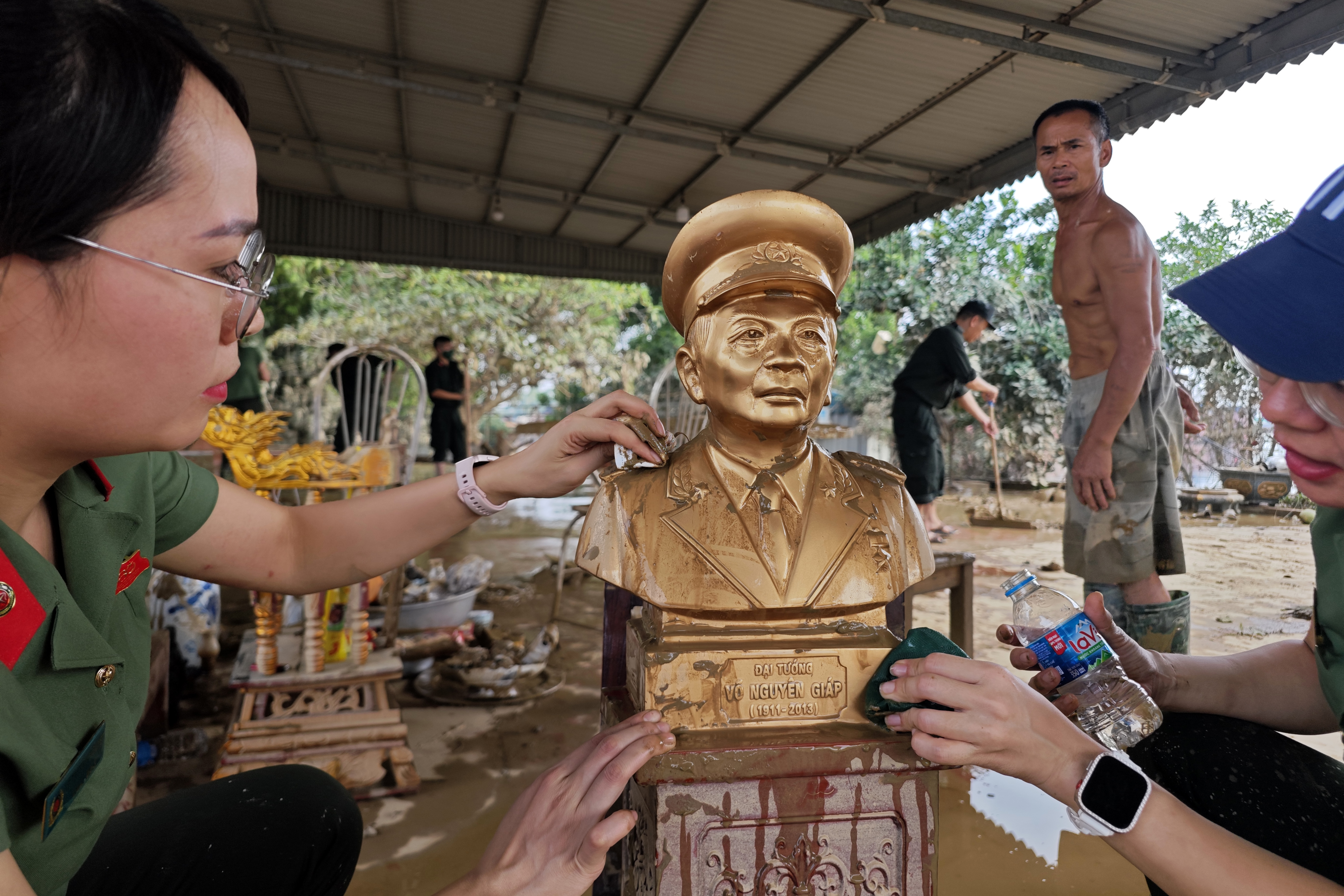 Tượng Đại tướng Võ Nguyên Giáp để trên bàn thờ đang được các cán bộ, chiến sỹ Công an Thủ đô lau sạch