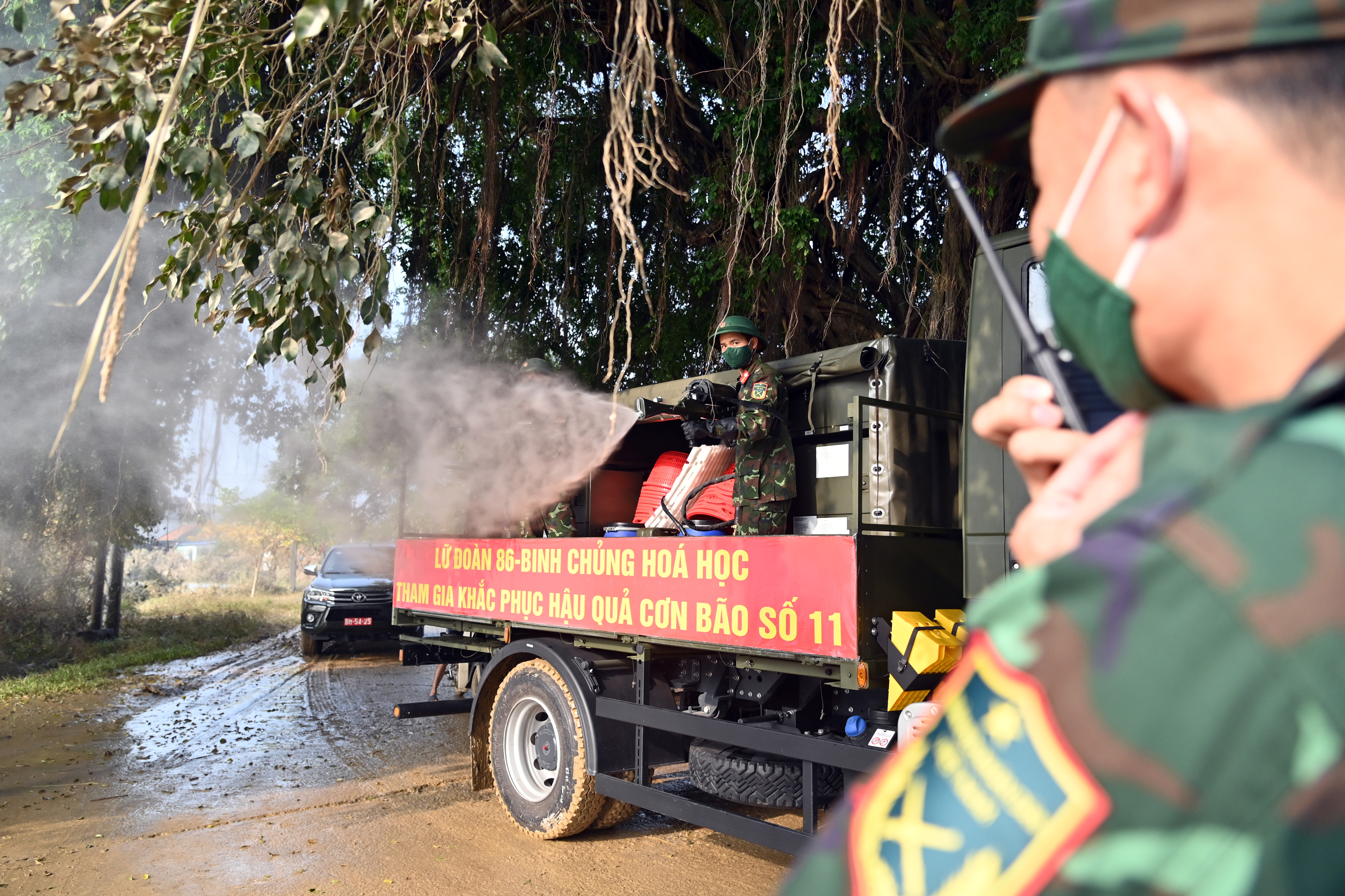 Các y, bác sỹ Bệnh viện CATP Hà Nội cùng tham gia khử khuẩn môi trường cùng lực lượng quân đội, định vị rõ những nơi có khả năng để lại vi trùng gây bệnh sau mưa lũ