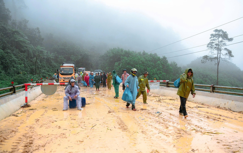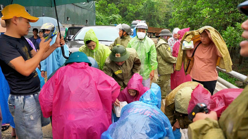 Nhóm hơn 20 người góp tiền mua mì tôm, lương khô, nước uống rồi cõng từng thùng vượt qua điểm sạt lở. Đường lên đèo lầy lội, nhiều đoạn bị sụt lún, nước xiết cắt ngang. Trong ngày nhóm đã phát hàng chục hộp mì, nước uống và lương khô cho người kẹt trên đèo.