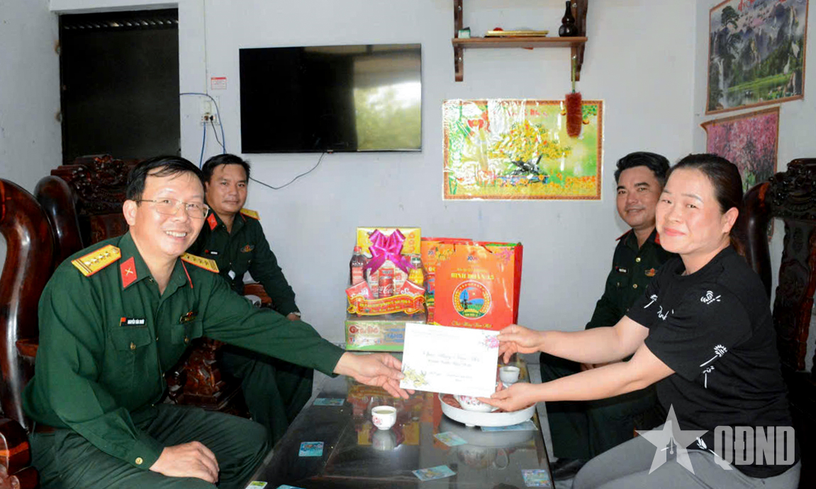 Đại tá Nguyễn Văn Mười, Bí thư Đảng ủy, Phó đoàn trưởng Đoàn Kinh tế - Quốc phòng 78 trao quà, động viên gia đình người lao động trước khi lên xe về quê ăn Tết.