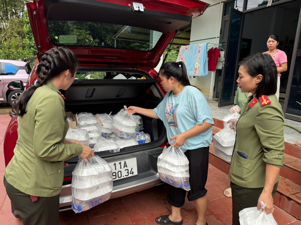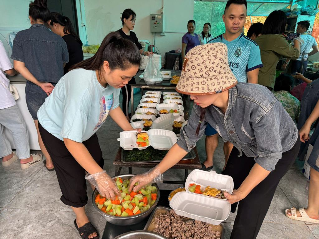 Gian bếp được đặt ngay tại nhà riêng của chị, bởi cửa hàng cũng nằm trong khu vực bị ngập sâu. Những nồi cơm trắng, rau xào, cá kho tuy giản dị nhưng đầy đủ dinh dưỡng, được chế biến, đóng gói cẩn thận và chuyển đến tận tay từng hộ dân. Chị Thu chia sẻ: Nhìn thấy nhiều gia đình bị ngập sâu, bếp nấu hư hỏng tôi chỉ nghĩ làm sao để mọi người có một bữa cơm nóng trong lúc khó khăn nhất. Thật may mắn là thông qua mạng xã hội, tôi đã nhận được sự chung tay nhiệt tình từ các cán bộ, chiến sỹ Công an tỉnh và nhiều nhà hảo tâm đóng góp, ủng hộ. Nhờ vậy, từng hộp cơm nóng hổi được trao tận tay bà con, cán bộ. Với tôi, mỗi suất cơm gửi đi là một phần tình cảm, mong bà con vơi bớt nhọc nhằn, thêm ấm lòng giữa hoạn nạn.