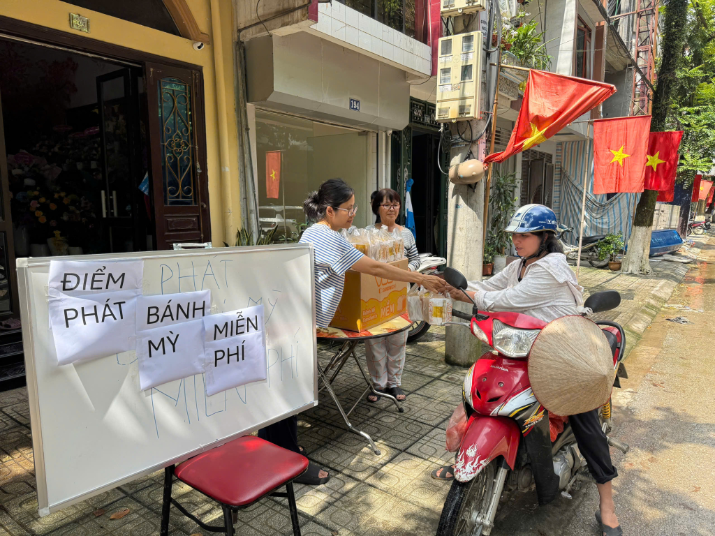 Tại phường Thục Phán, căn nhà nhỏ của hai mẹ con chị Đinh Thị Thùy Linh trở thành điểm phát bánh mì miễn phí cho người dân. Không biển hiệu rầm rộ, chỉ vài dòng chữ in vội và những lời hỏi han chân tình, mỗi ngày hai mẹ con chuẩn bị hàng trăm ổ bánh mì để phát cho bà con qua lại trên tuyến đường ngập.