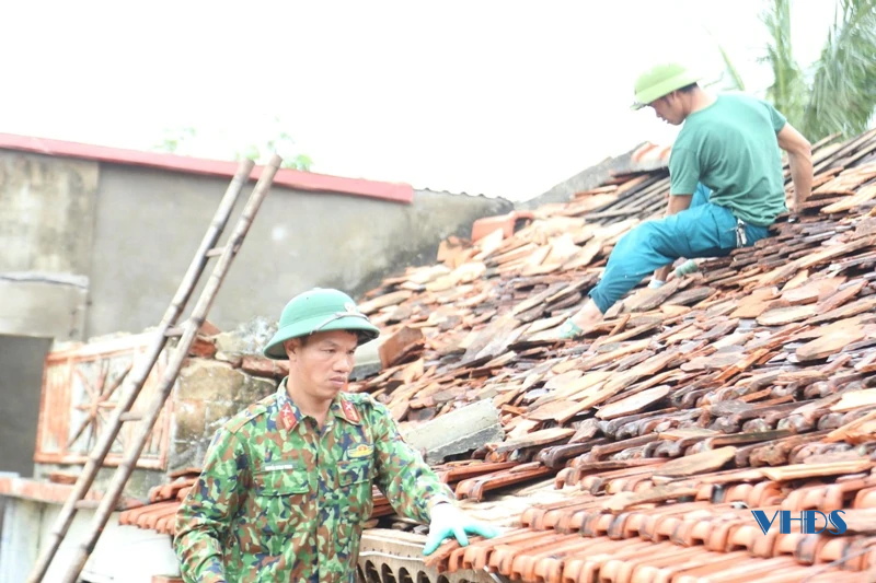 Lực lượng vũ trang hỗ trợ người dân lợp lại mái nhà bị hỏng do mưa bão