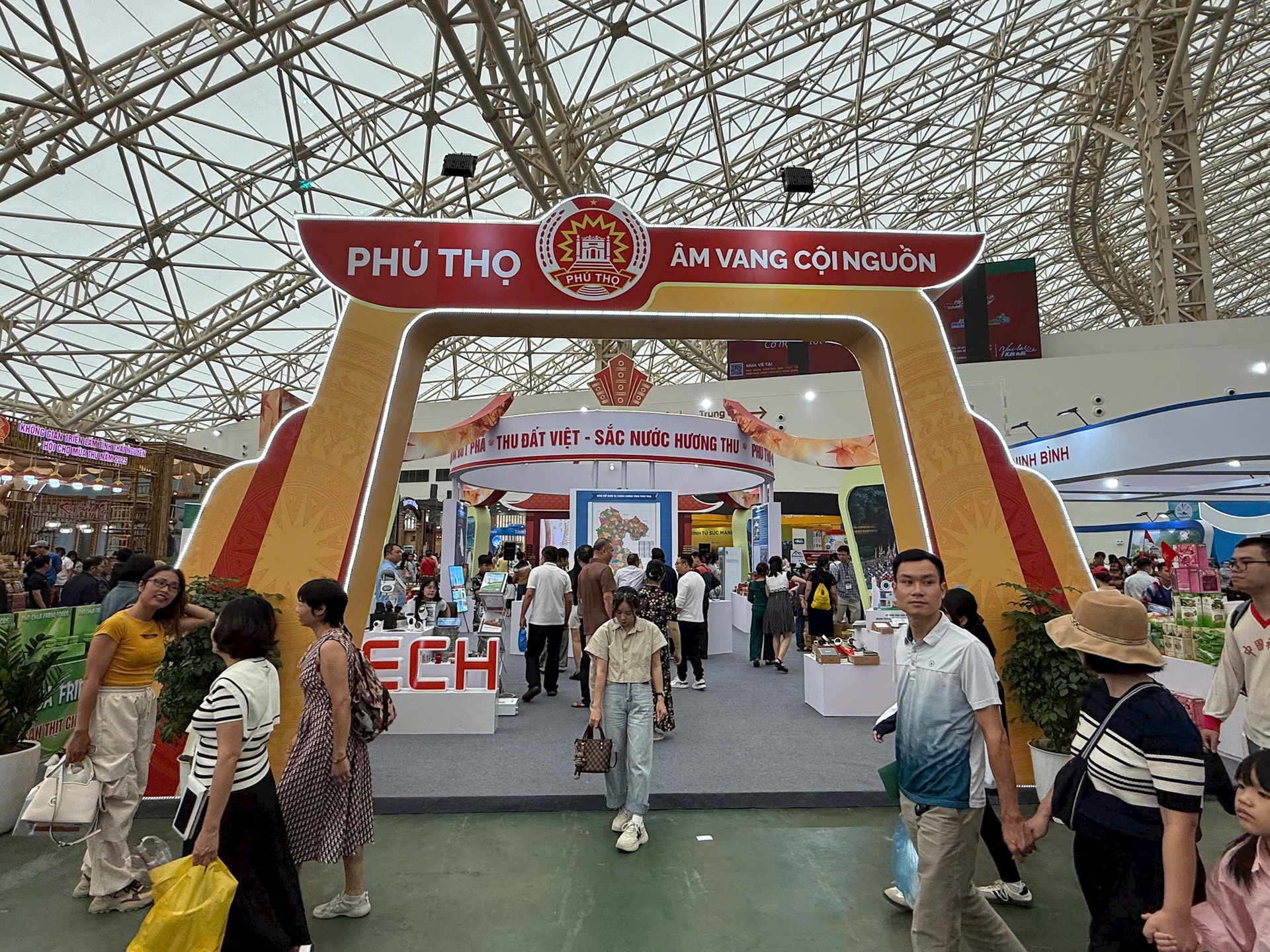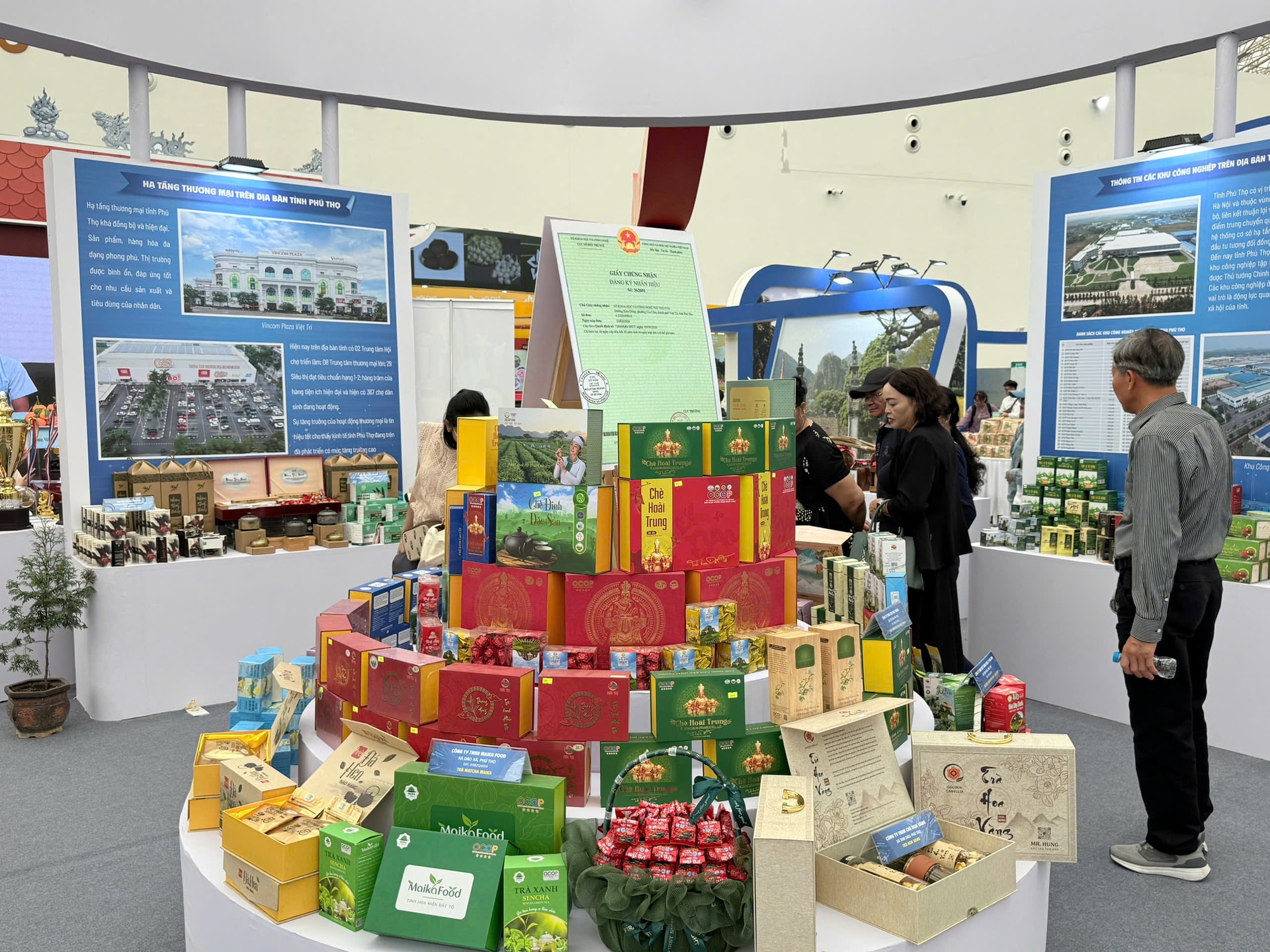 Với chủ đề "Âm vang cội nguồn", không gian trưng bày của tỉnh Phú Thọ có diện tích 200m², giới thiệu gần 300 sản phẩm tiêu biểu của hơn 60 doanh nghiệp, hợp tác xã. Các sản phẩm mang đậm bản sắc vùng Đất Tổ, từ nhóm OCOP, sản phẩm công nghiệp nông thôn tiêu biểu như chè Long Cốc, trà Hoa Vàng, mì gạo Hùng Lô, bánh chưng, bánh giầy, bưởi Đoan Hùng, đến các sản phẩm thủ công mỹ nghệ như gốm sứ, tranh đá quý, thổ cẩm...