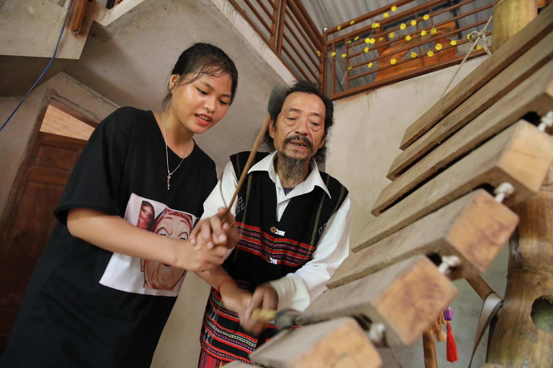 Nghệ nhân dân gian Kray Sức dạy đàn A Toong cho thế hệ trẻ - Ảnh: PHAN TÂN LÂM