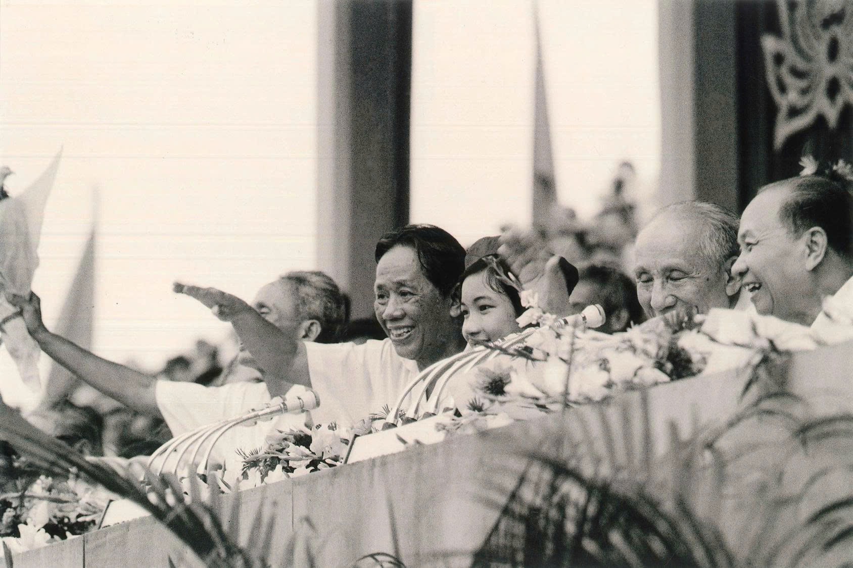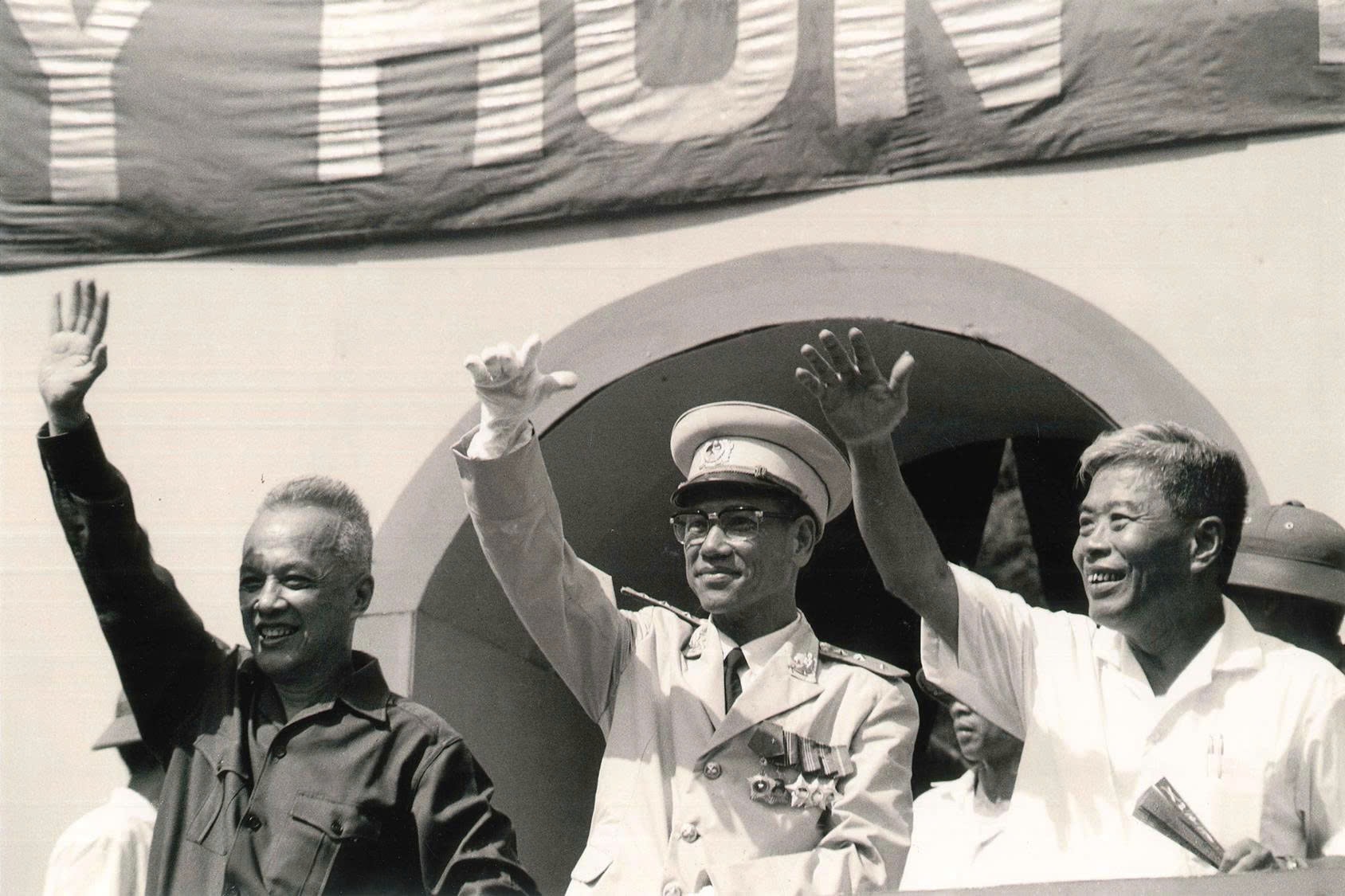 Chủ tịch Ủy ban Quân quản thành phố Sài Gòn - Gia Định Trần Văn Trà và các đồng chí Phạm Hùng, Nguyễn Hữu Thọ trên lễ đài mừng chiến thắng, Sài Gòn, ngày 15/5/1975 Nguồn: TTXVN