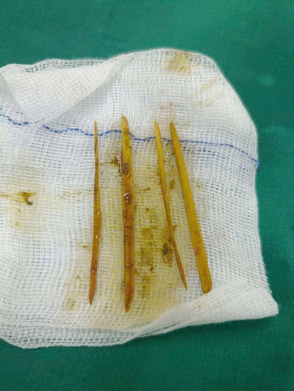 Ngoài ra, trong lòng ruột non vùng dưới rốn còn ghi nhận thêm một dị vật tăng tỷ trọng khác kích thước khoảng 48 x 2,2 mm, nằm dọc theo lòng ruột. Tổng cộng ghi nhận ba dị vật sắc nhọn trong đường tiêu hóa.